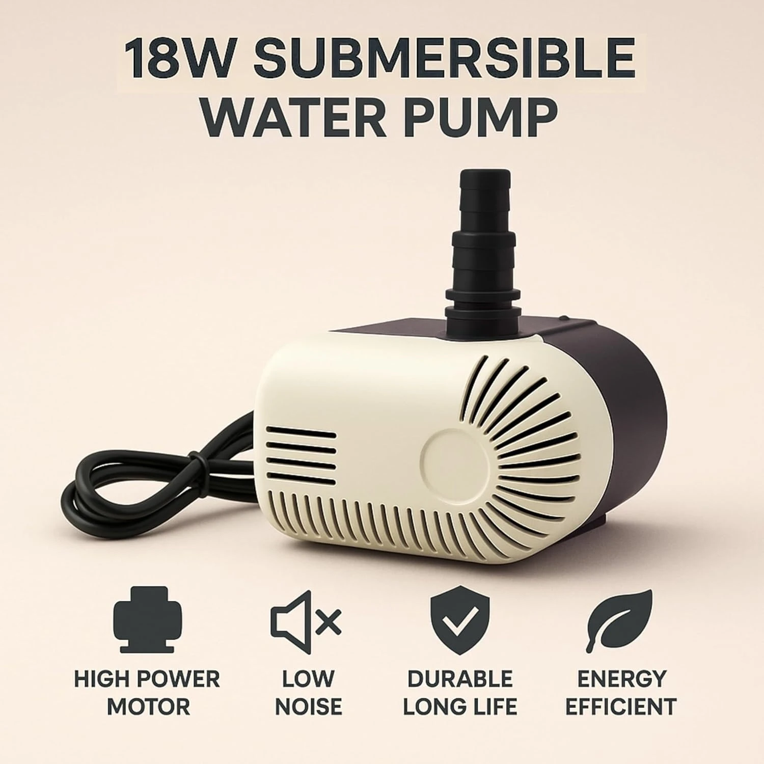 RELIABLE PERFORMANCE – Compact yet powerful 18W submersible motor designed for desert air coolers, aquariums, fountains, hydroponics, small ponds, and garden water features. Built for continuous 24x7 operation.