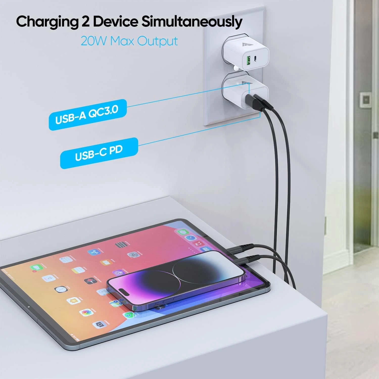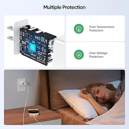 Adapter features a 2-in-1 design, with integrated USB-A and PD 20W Type C ports that make it compatible with a wide range of devices, including iPhone, iPad, iPod, AirPods, and Android devices.