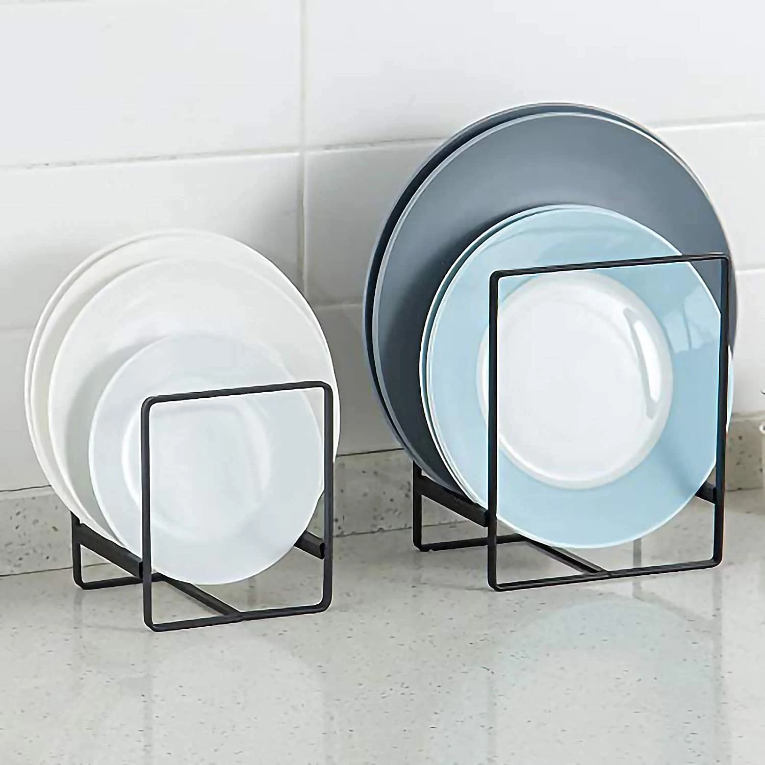 Square plate holder can be free standing, just set it on the countertop for storage; put it on the dinner table for display; place it on the desk for drying; use it in the cupboard, cabinet and pantry for organizing.