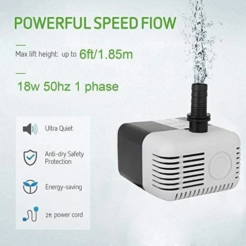 High-Performance 18W Submersible Pump – Versatility Meets Reliability Upgrade your water circulation system with this powerful and highly versatile 18 Watt submersible water pump. Whether you're seeking a robust replacement pump for your desert air cooler, a dependable aerator for your aquarium, or the heart of a beautiful fountain or pond, this unit is engineered for optimal performance. Engineered for Maximum Lift: Don't settle for weak water flow. Our 18W motor is specifically designed to handle demanding applications, providing an impressive 6-foot (1.8m) maximum lift. This ensures that even in the largest desert coolers or high-standing water features, you'll get consistent, powerful water distribution. Built to Last: Featuring a durable waterproof housing and a long-life motor, this pump resists corrosion and wear, promising years of trouble-free operation. The compact design allows for easy placement, and the simple, detachable filter makes cleaning mineral buildup a quick and easy task. Specifications: Power Consumption: 18 Watts Max Water Lift: 6 Feet (approx. 1.8 meters) Voltage: [Specify Voltage, e.g., 220V AC / 110V AC] Suitable for: Freshwater applications. Note: Always ensure the pump is fully submerged before operation.