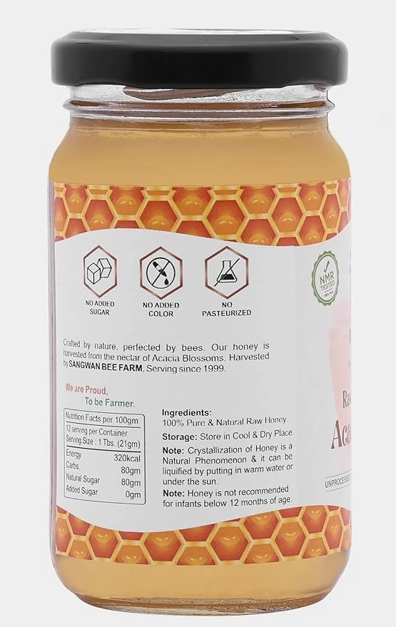 Sourced from Acacia Blossoms: Collected from Acacia tree flowers in pristine Himalayan and forest regions, known for producing light-colored, mild, and aromatic honey.