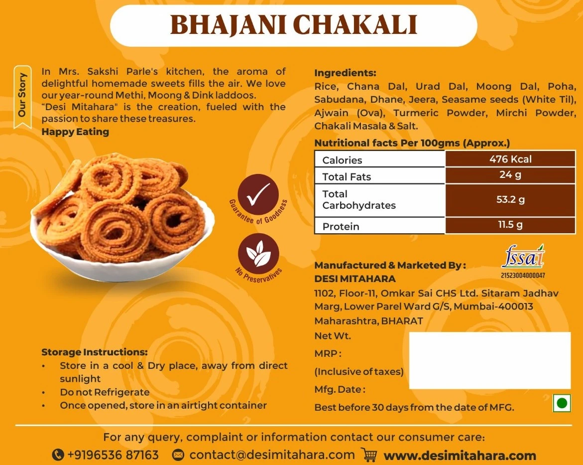 • Ingredients: Rice, Chana Dal, Urad Dal, Moong Dal, Poha, Sabudana, Black Paper, Dhane, Jeera, Sesame Seeds (White Til), Ajwain (Ova), Asafoetida (Hing), Edible Oil, Turmeric Powder, Mirchi Powder, Chakali Masala & Salt.