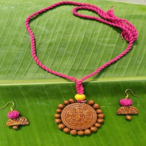 4. MATCHING EARRINGS INCLUDED: The set includes a pair of fan-shaped terracotta earrings with pink yarn beads and gold-toned hooks, completing the ethnic look.