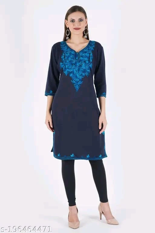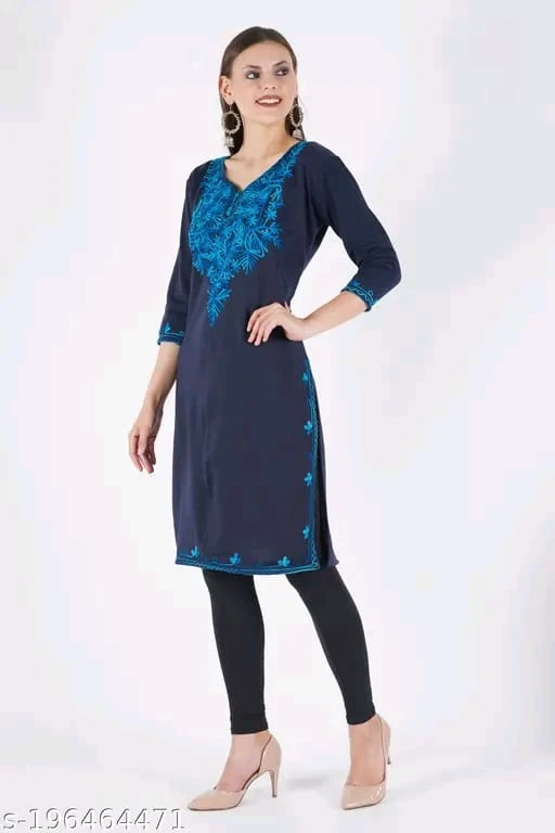 Embrace refined tradition with this navy blue kurti, beautifully accented with bright blue floral embroidery. Featuring a graceful V-neckline and three-quarter sleeves, the embroidery highlights the neckline, cuffs, and hemline for a cohesive and elegant look. Paired with sleek black leggings and beige high-heeled shoes, this outfit is perfect for festive occasions, cultural events, or stylish everyday wear. The ensemble is completed with statement dangling earrings, adding a touch of glamour to its ethnic charm.
