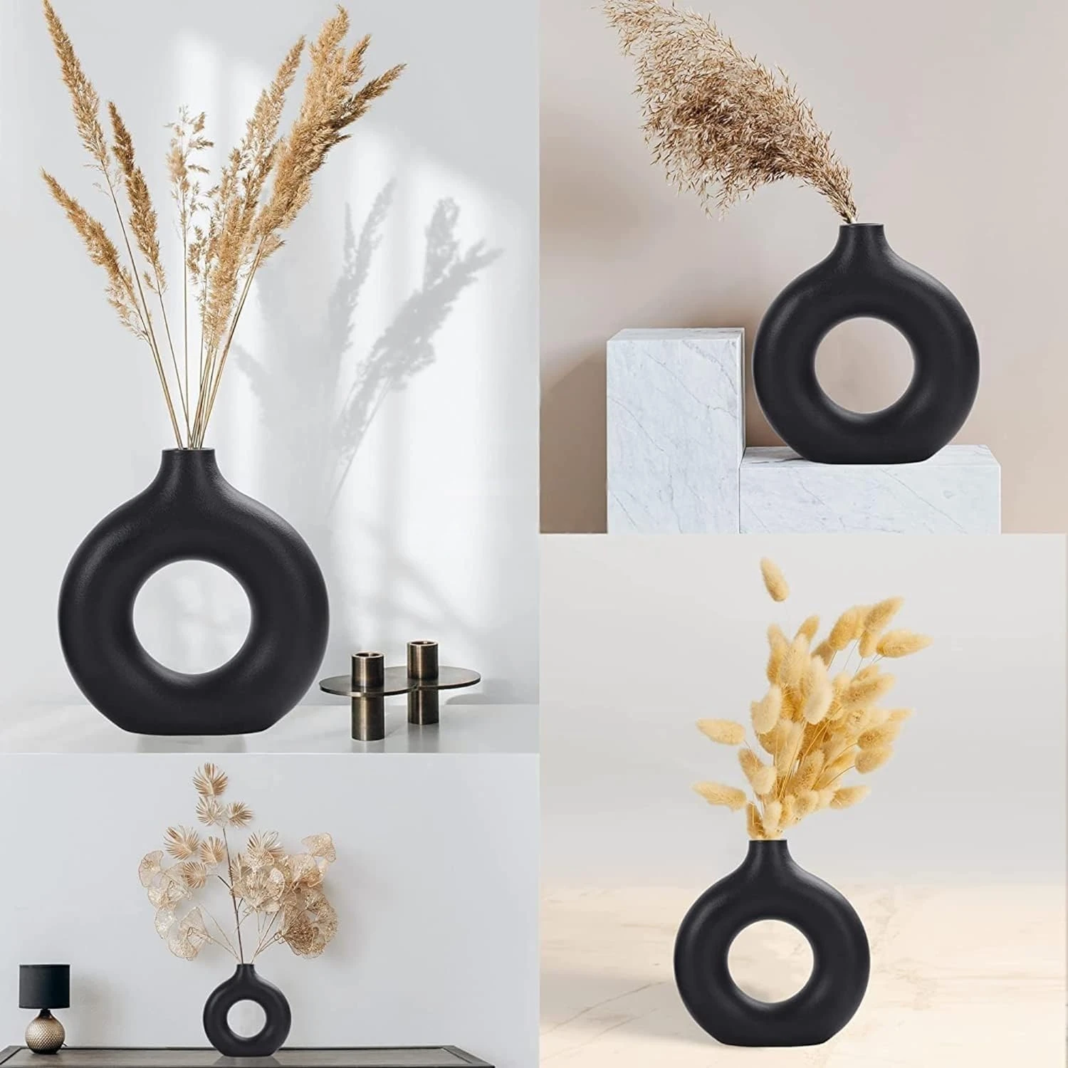 Metro Kreations Ceramic Donut Vase | Round Hollow Centerpiece | Minimalist Flower Vase for Pampas Grass & Table Showpiece | Ideal for Living Room, Shelf & Office Decor (Black, 6 inch) Pack of 1