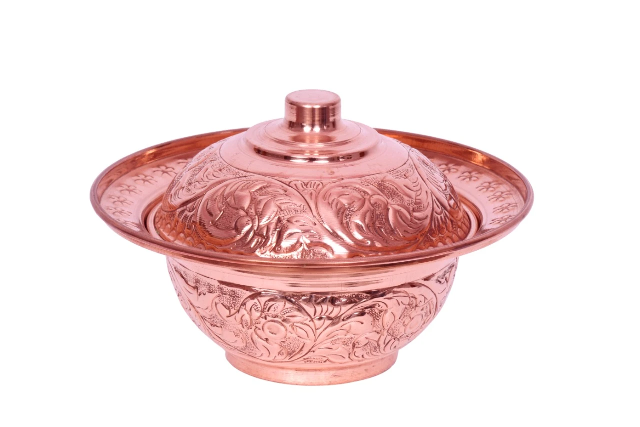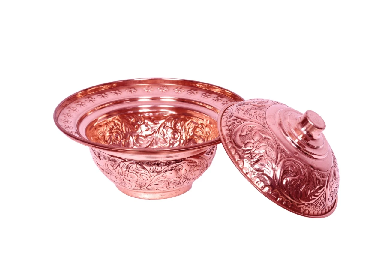 Crafted from high-quality copper, it ensures durability and long-lasting shine. The secure lid helps retain heat and keeps food fresh, making it ideal for daily use as well as special occasions.