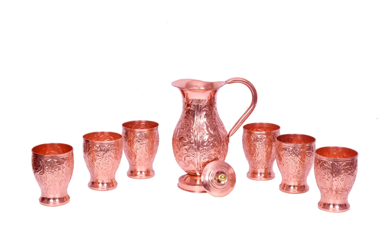 The royal design and polished copper finish give this set a premium and sophisticated look, making it a centerpiece on your dining table. The jug features a sturdy handle and a smooth pouring spout for convenience, while the glasses are designed for a comfortable grip and elegant serving experience.