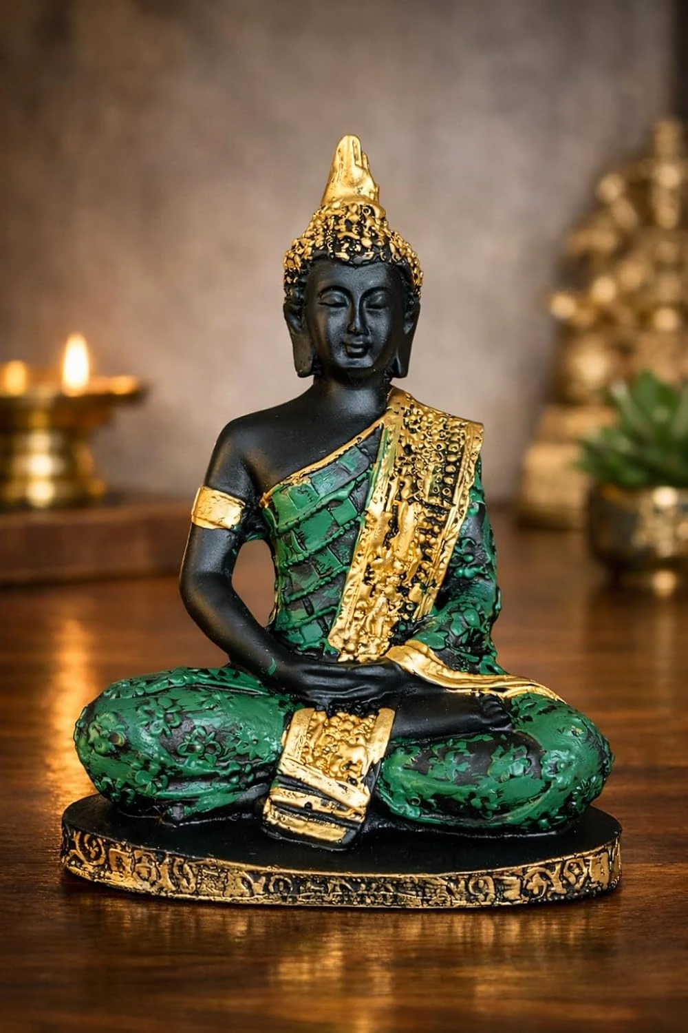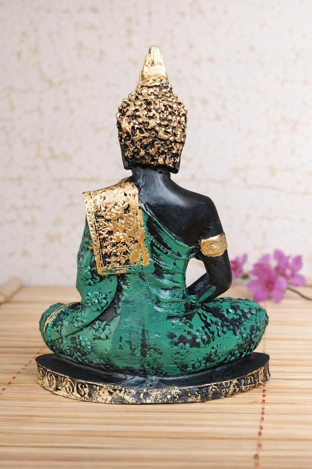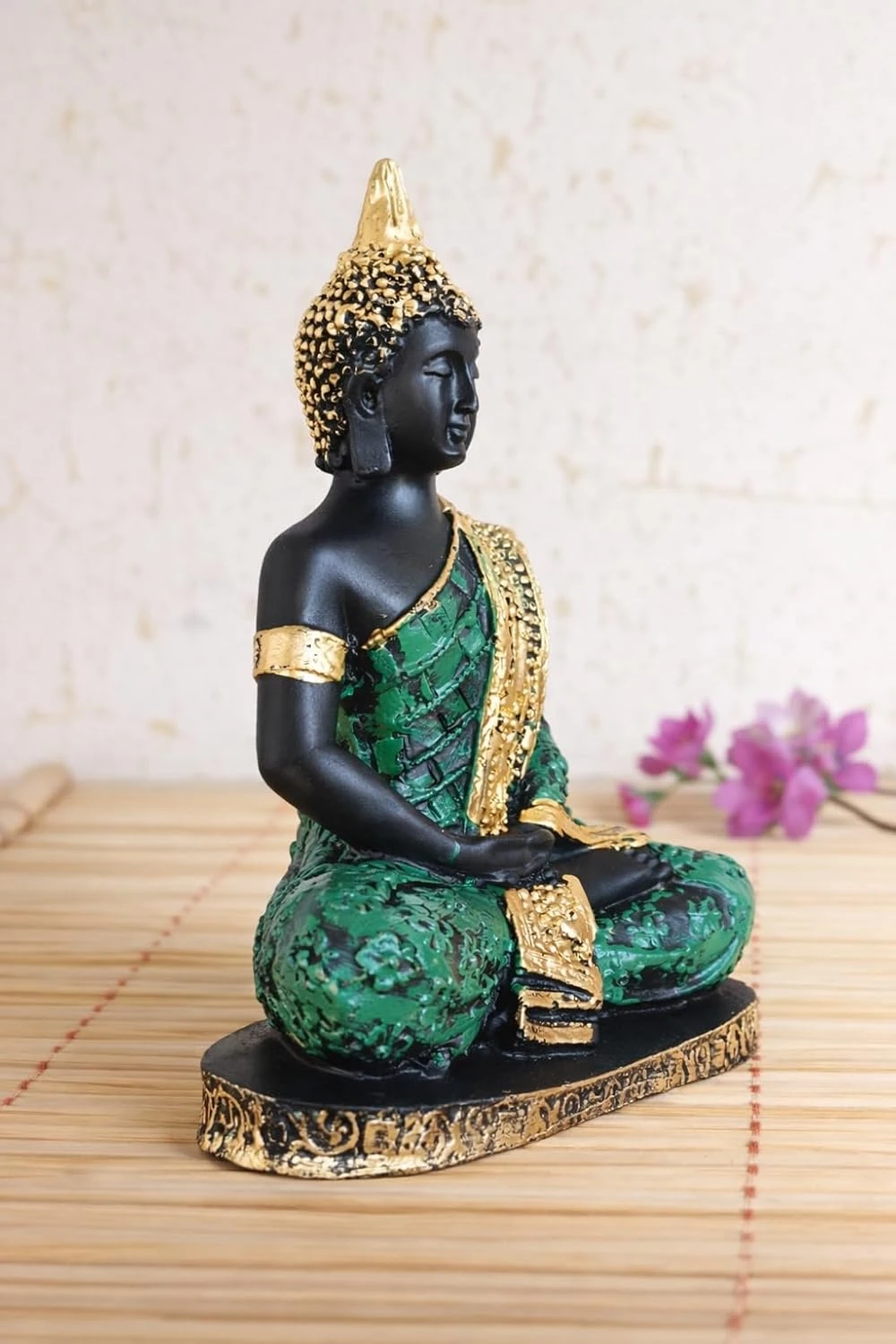Decorative Buddha Figurine, Black and Gold, Resin, Meditating Pose, Traditional Asian Style, Religious Theme (Green Black)