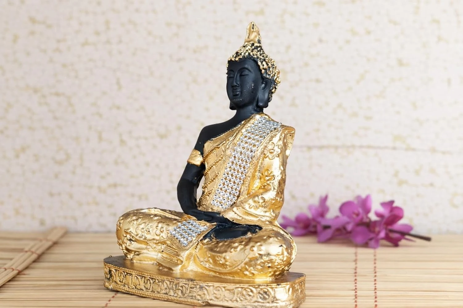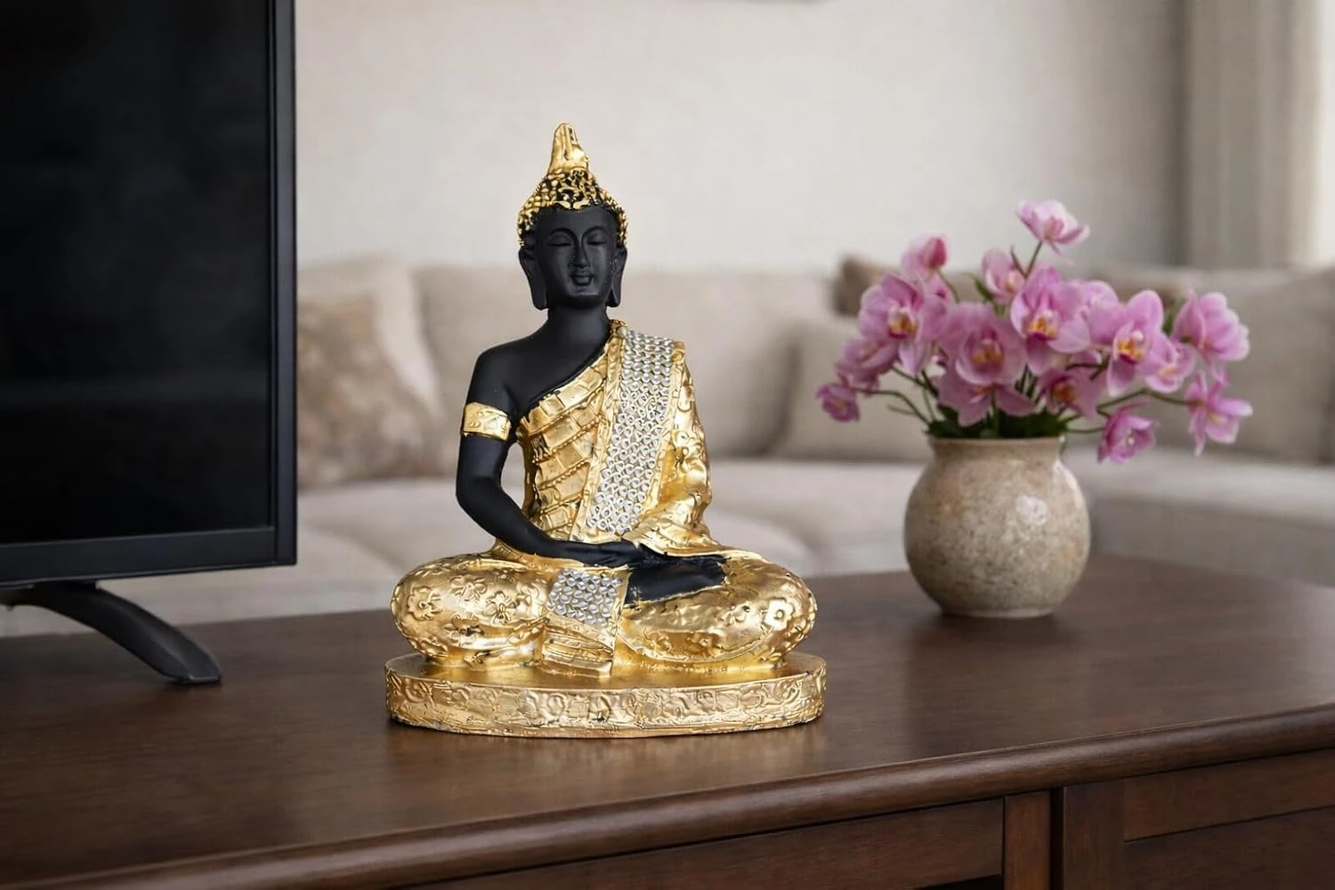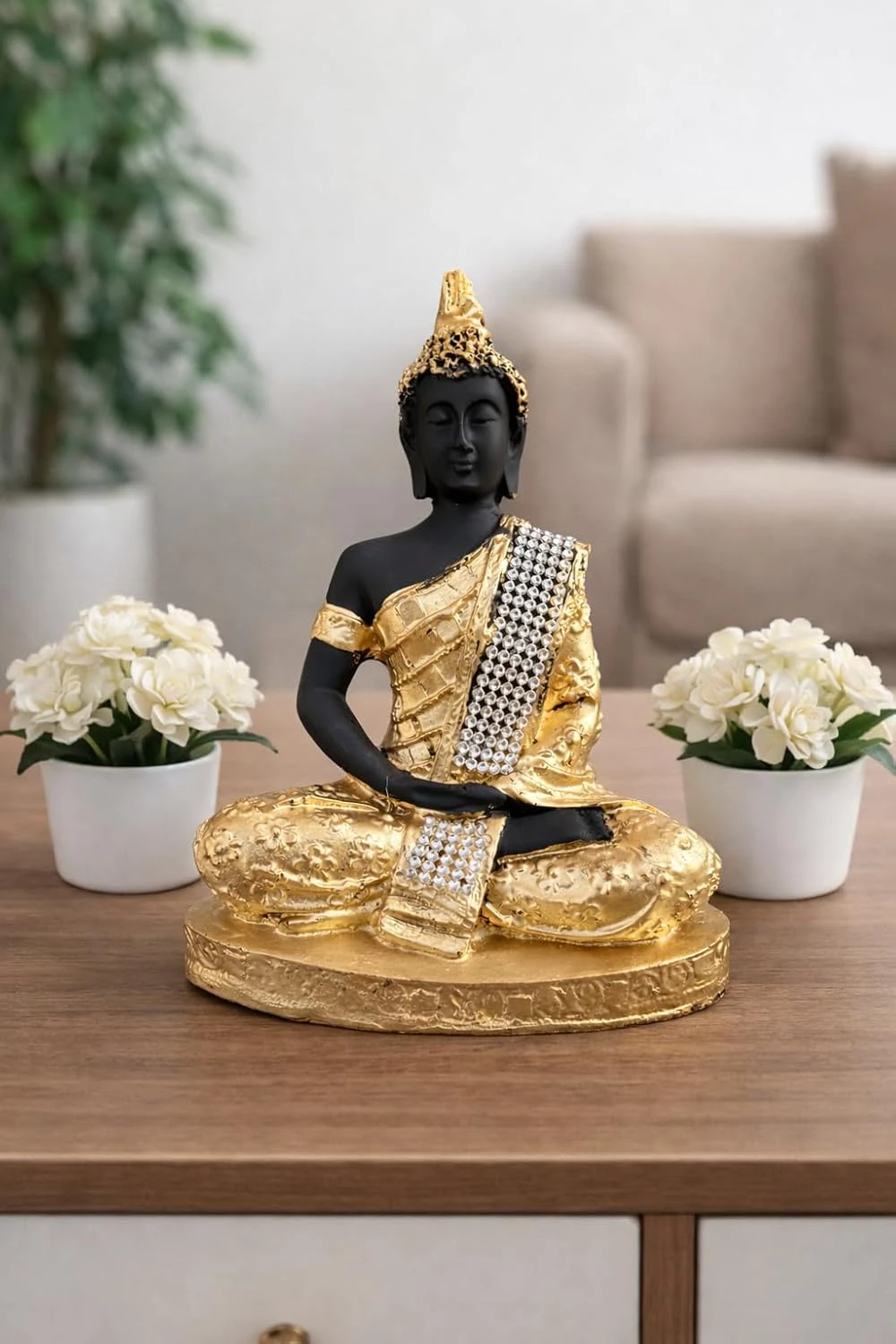 Meditating Buddha statue features a serene black matte finish body beautifully contrasted with ornate gold detailing on the robes, crown, and base for a striking spiritual aesthetic