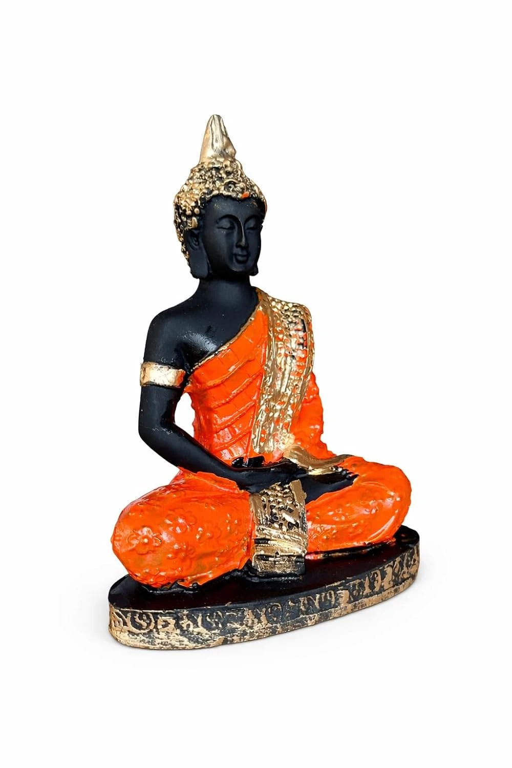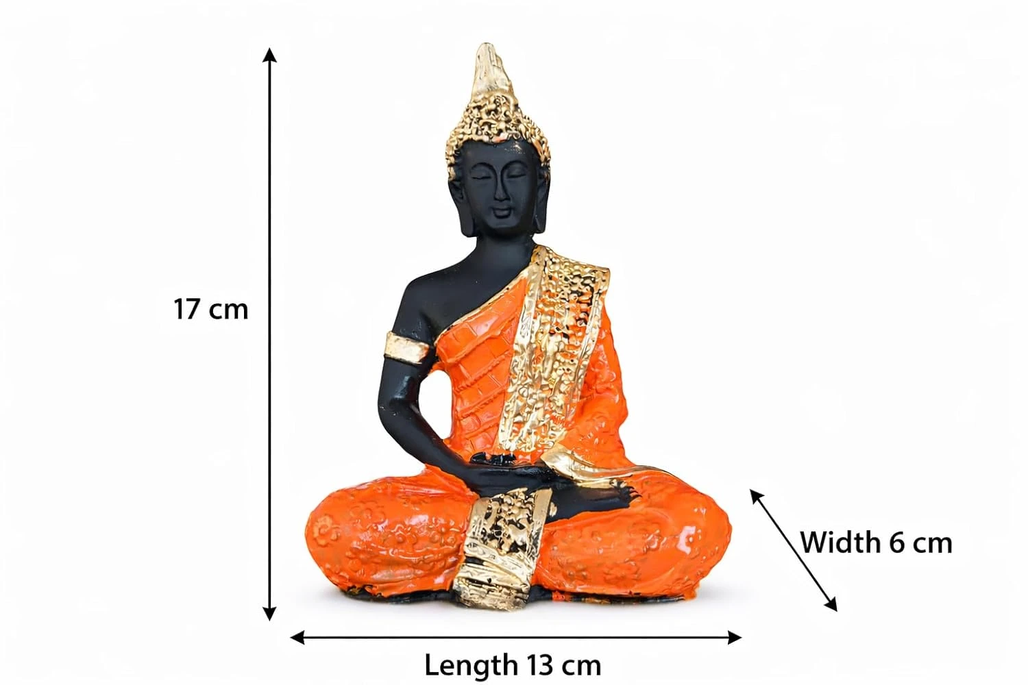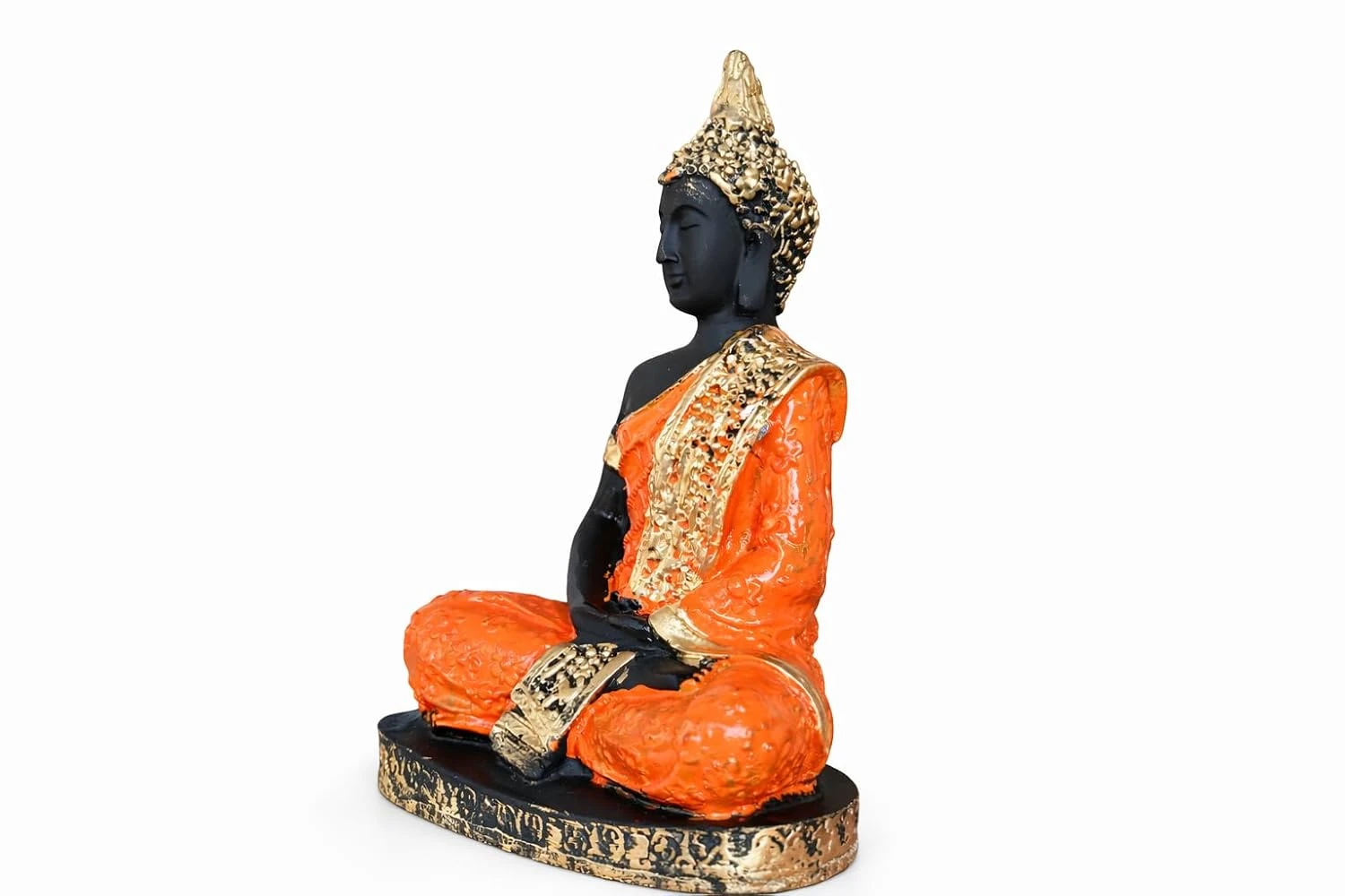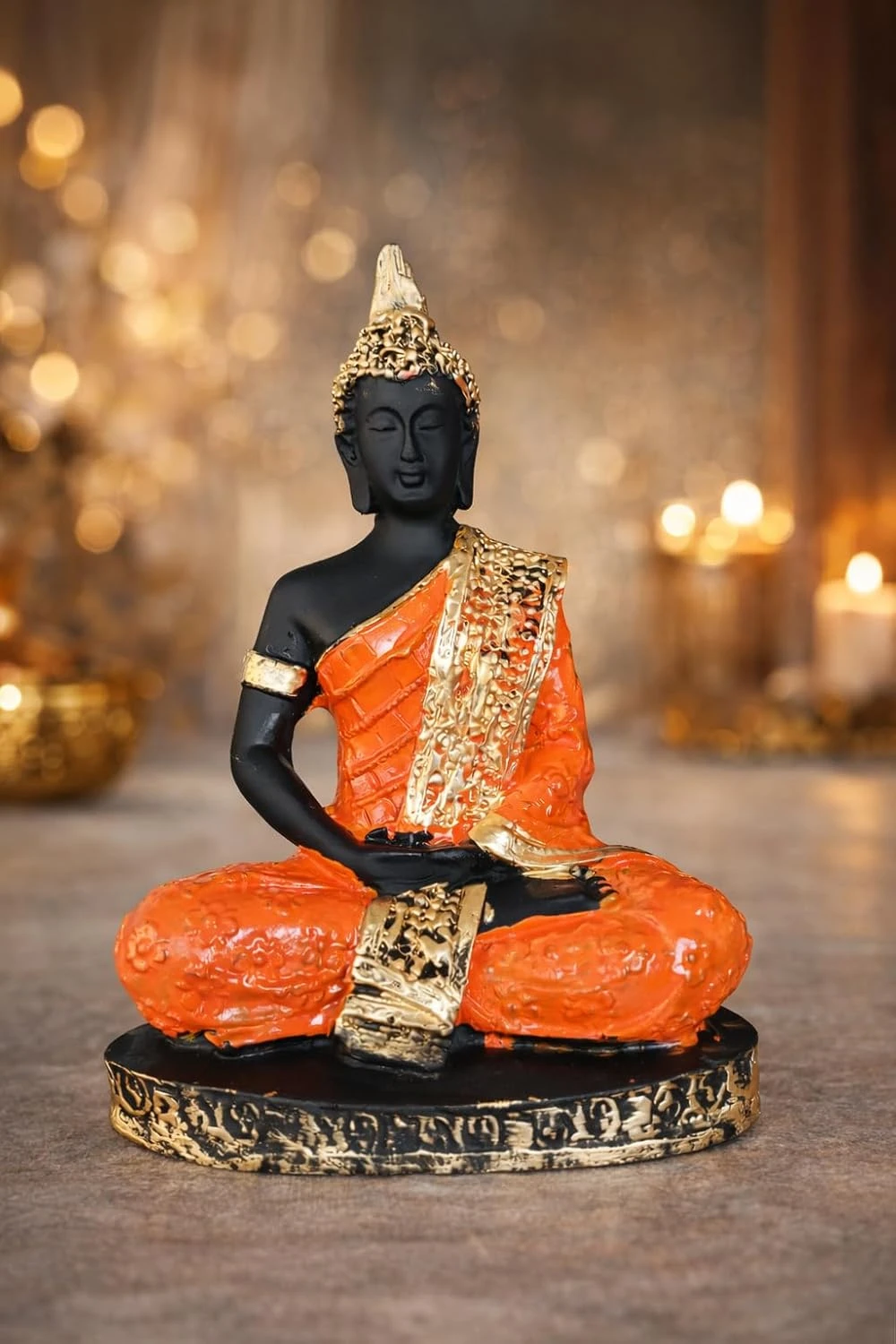 Meditating Buddha statue features a serene black matte finish body beautifully contrasted with ornate gold detailing on the robes, crown, and base for a striking spiritual aesthetic