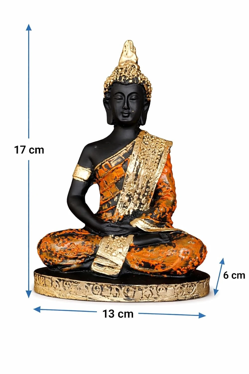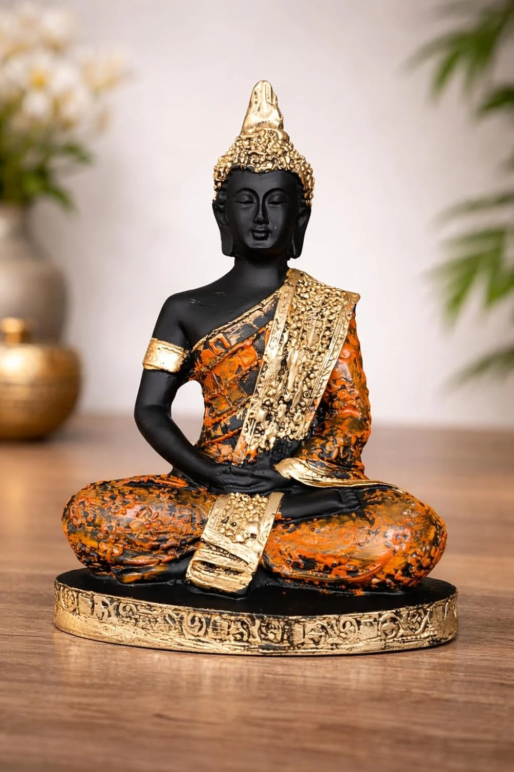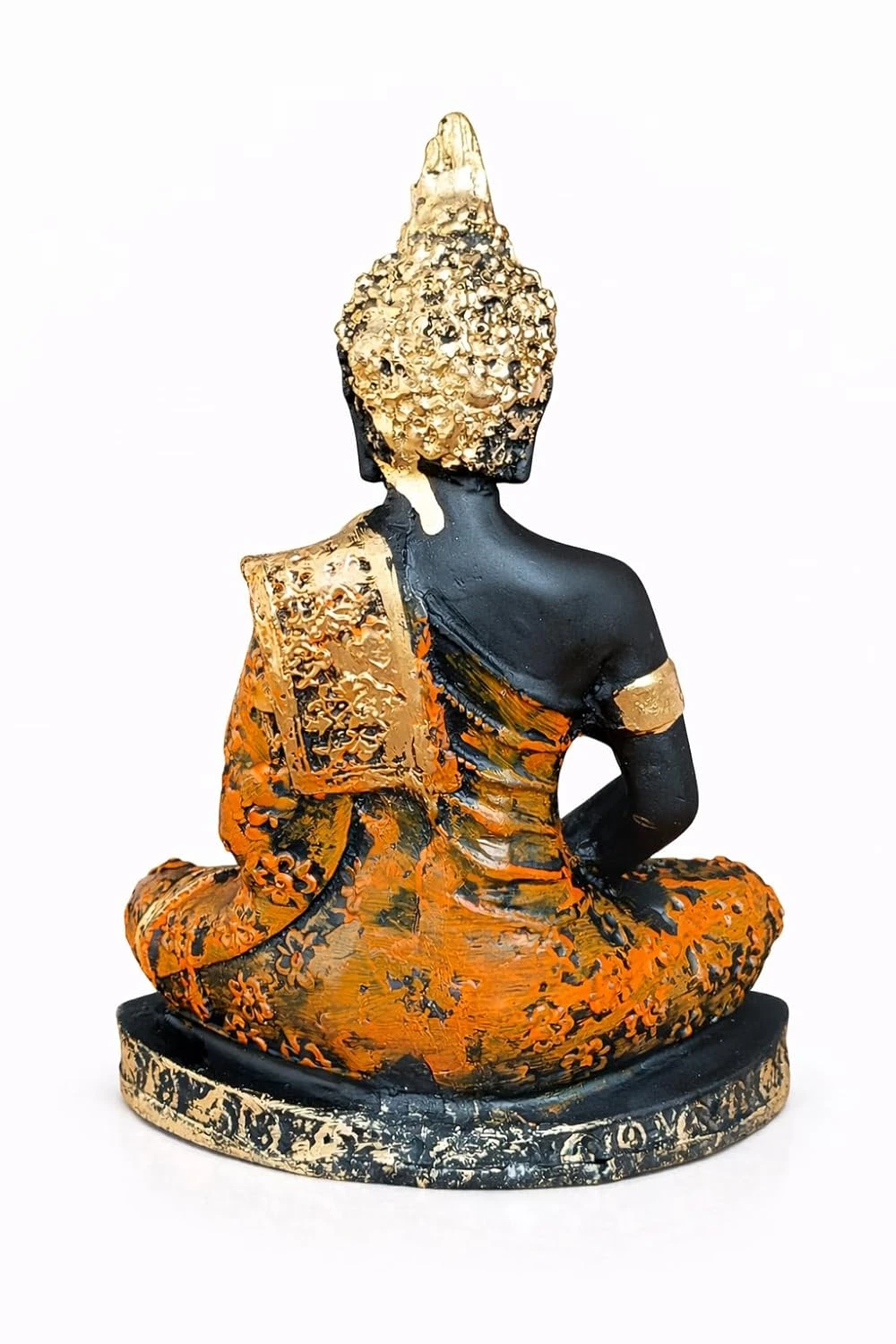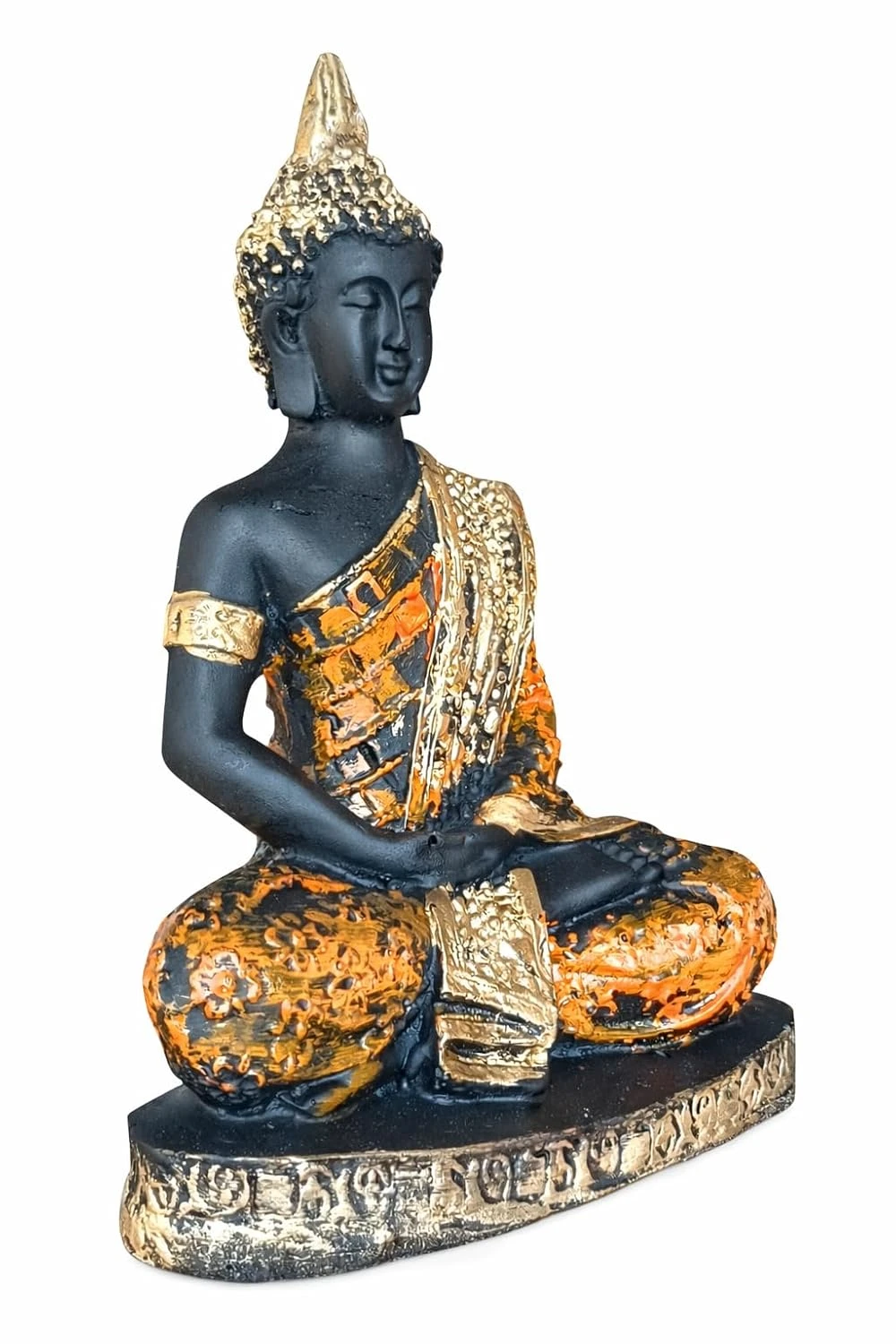 Meditating Buddha statue features a serene black matte finish body beautifully contrasted with ornate gold detailing on the robes, crown, and base for a striking spiritual aesthetic
