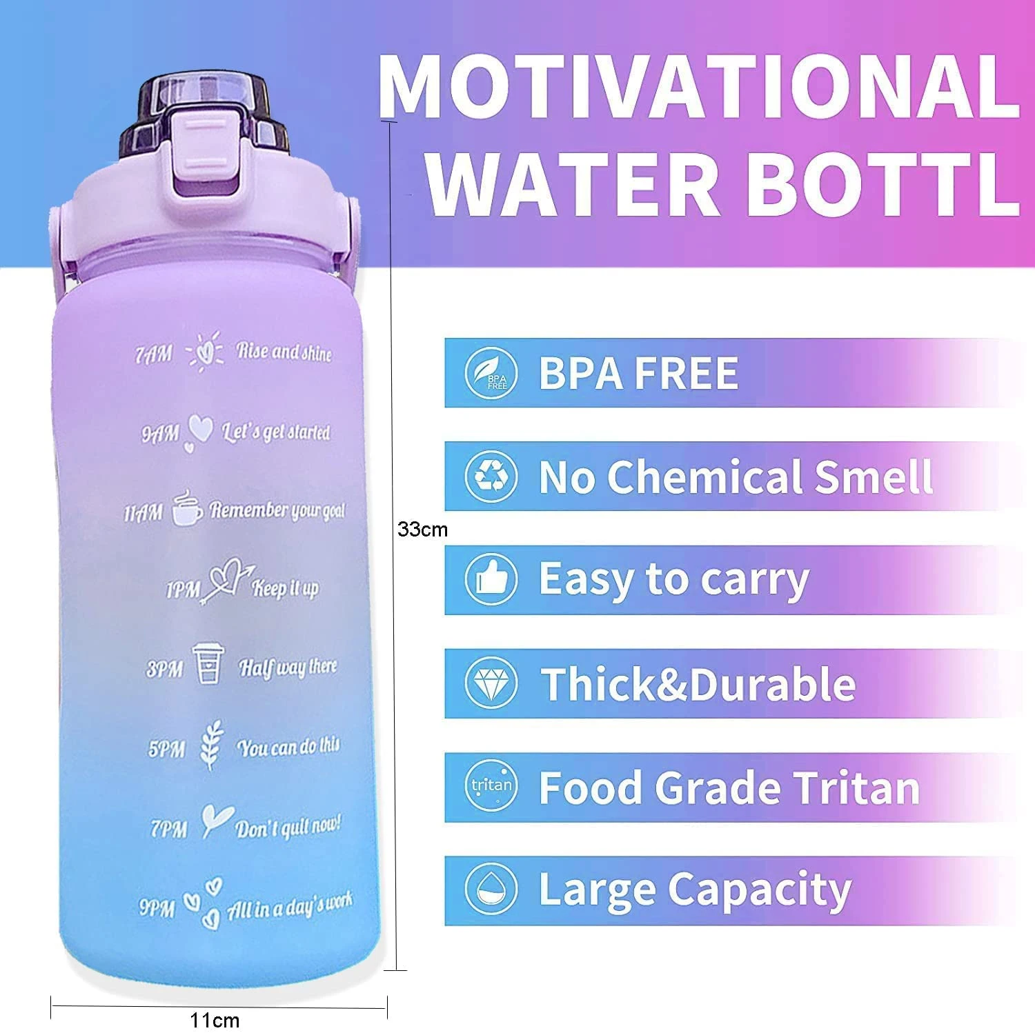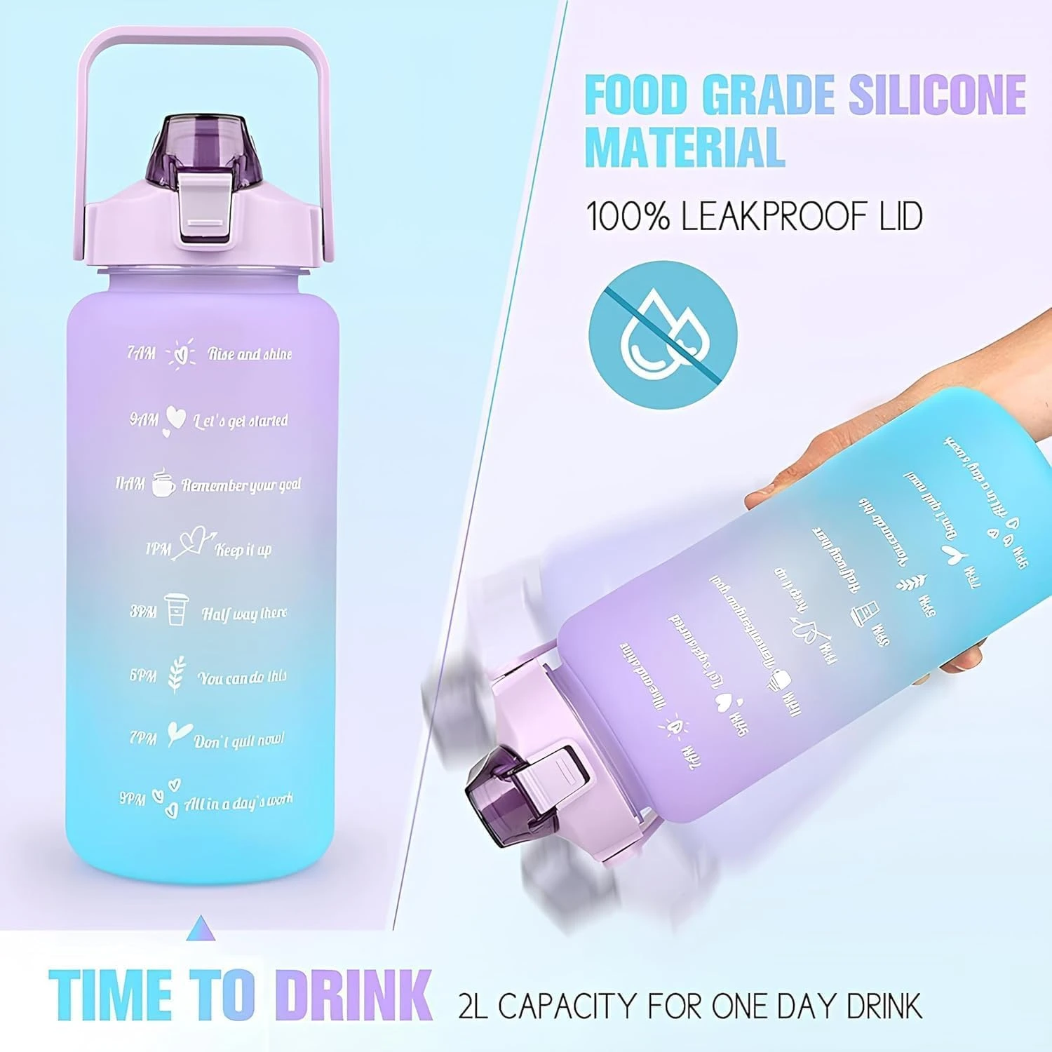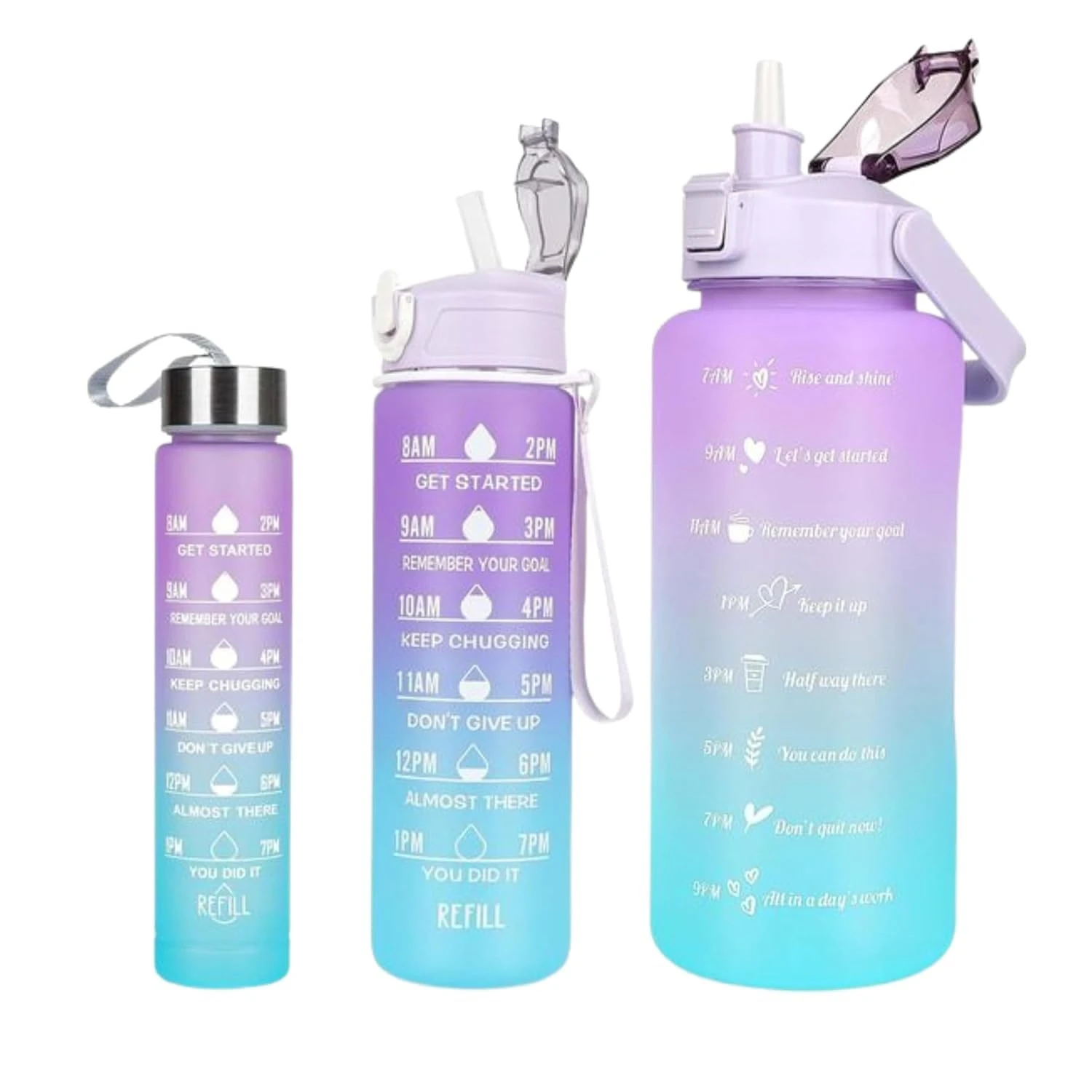 1. Time Markers for Hydration Tracking: Each bottle features time markers that serve as a reminder to drink water throughout the day, helping you achieve your hydration goals. These markers encourage consistent water intake, promoting better health and well-being.