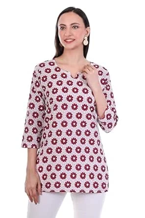 Erosion Fashion Women's Cotton Floral Print Short Kurti, Round & V-Neck, 3/4 Sleeve, Straight Short Kurta| A line Topper Color Maroon