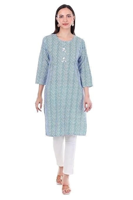 The classic design showcases a beautiful blend of traditional aesthetics and contemporary style, making it perfect for casual outings and daily wear. The 3/4 sleeve length offers comfortable mobility while maintaining a graceful appearance. Crafted from quality cotton fabric, this kurta ensures comfort throughout the day. The straight cut silhouette flatters various body types, while the striped pattern in refreshing blue and white adds a modern touch to the traditional design.
