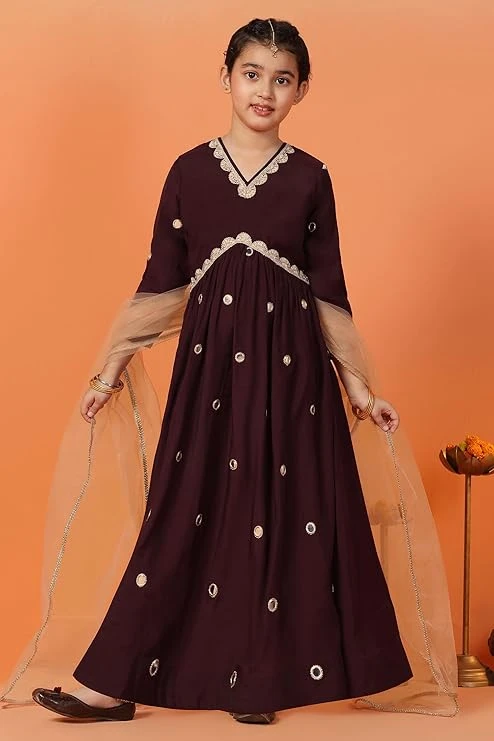 Girl's Embroidered Maxi Dress with Dupatta Ethnic Dress for Girls | Maxi Length Dress with Dupatta | Embroidered Dress | Long Dresses Size: 9-10 Year Color Brown