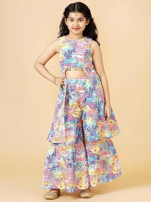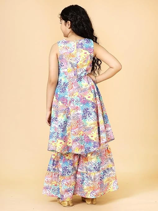 Girls Poly Silk Floral Printed 3/4 Sleeve Sharara Set | Traditional Ethnic Wear Clothing Set for Festival and Special Occasions Age 11-12 Year Color Multicolor