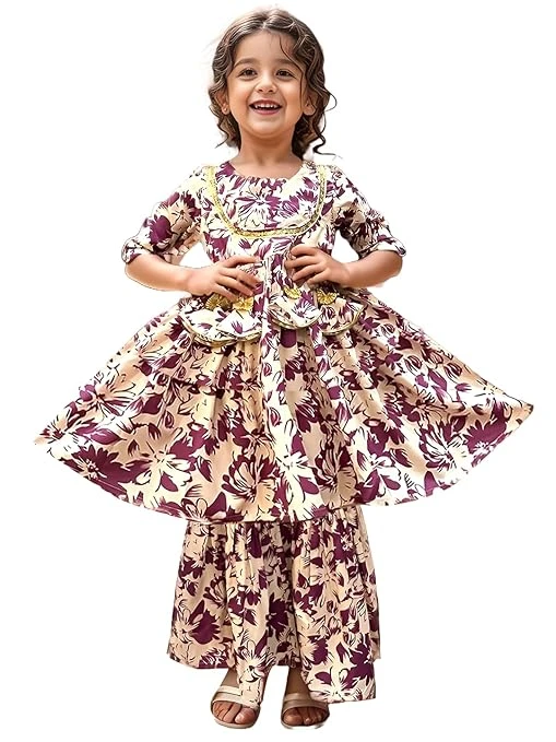 Girls Poly Silk Floral Printed 3/4 Sleeve Sharara Set | Traditional Ethnic Wear Clothing Set for Festival and Special Occasions Size Age 11-12 Year Cream