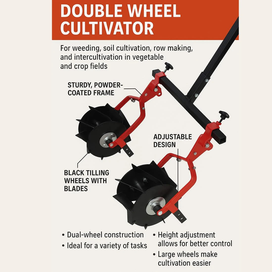 Introducing the Global Nature Agro Double Roller Weeder, your ultimate manual soil cultivator and grass remover, designed for efficient weeding in farming, vegetable fields, and row crops. This dual blade weeding tool is perfect for farmers, gardeners, and agricultural enthusiasts seeking a reliable and eco-friendly solution to maintain their land. With its innovative design, this weeder ensures thorough soil cultivation and effective grass removal, making it an essential tool for sustainable farming practices.