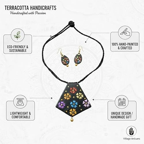1. Handcrafted Terracotta Jewelry Beautifully handcrafted terracotta necklace set featuring a detailed floral pendant. Designed to reflect traditional Indian artistry while adding an elegant ethnic touch to modern outfits.