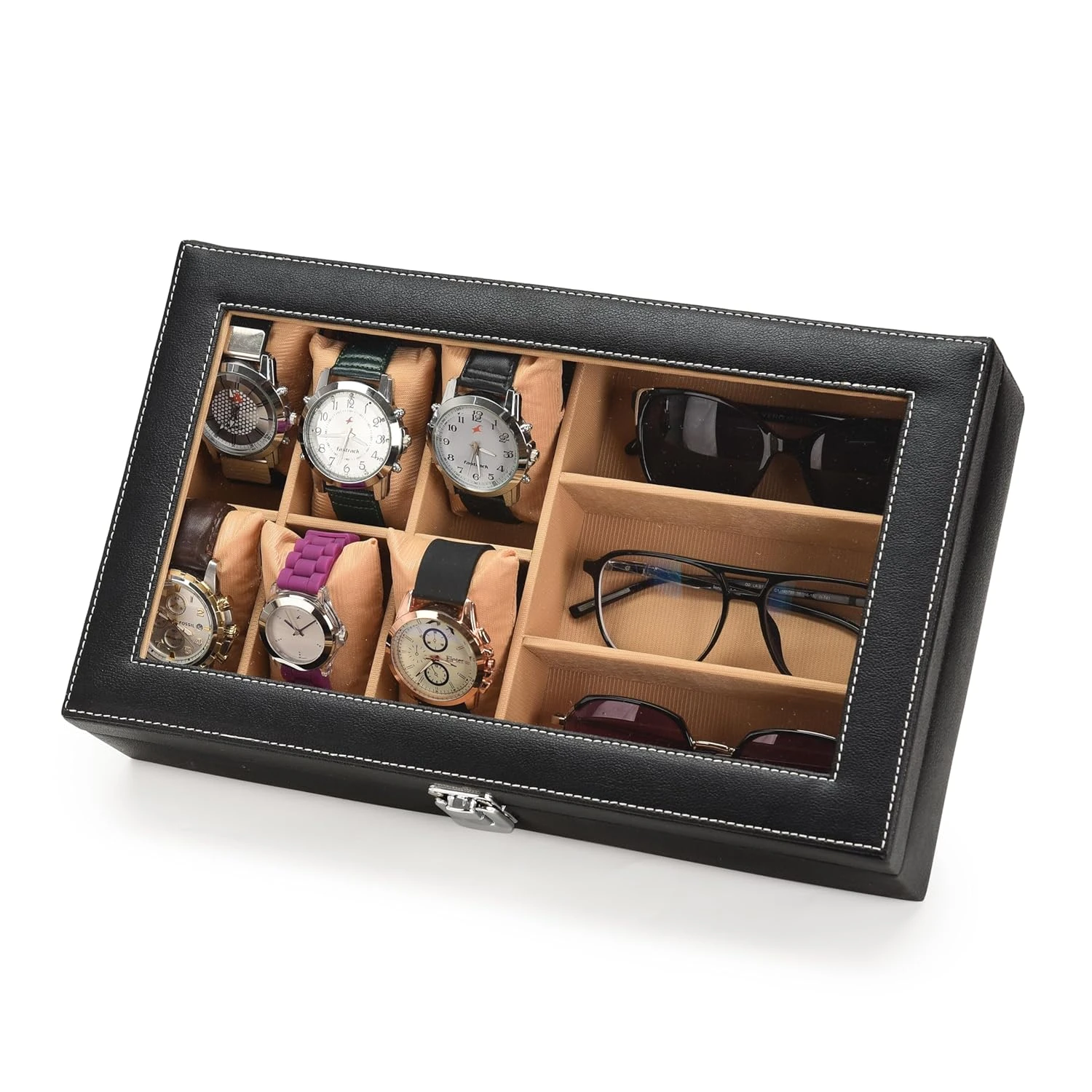 Men's and Women's Leatherette Watch organizer holder Case for 6 Slots for Watches and 3 Slots for Sunglassesin Black Color (Black::Black)