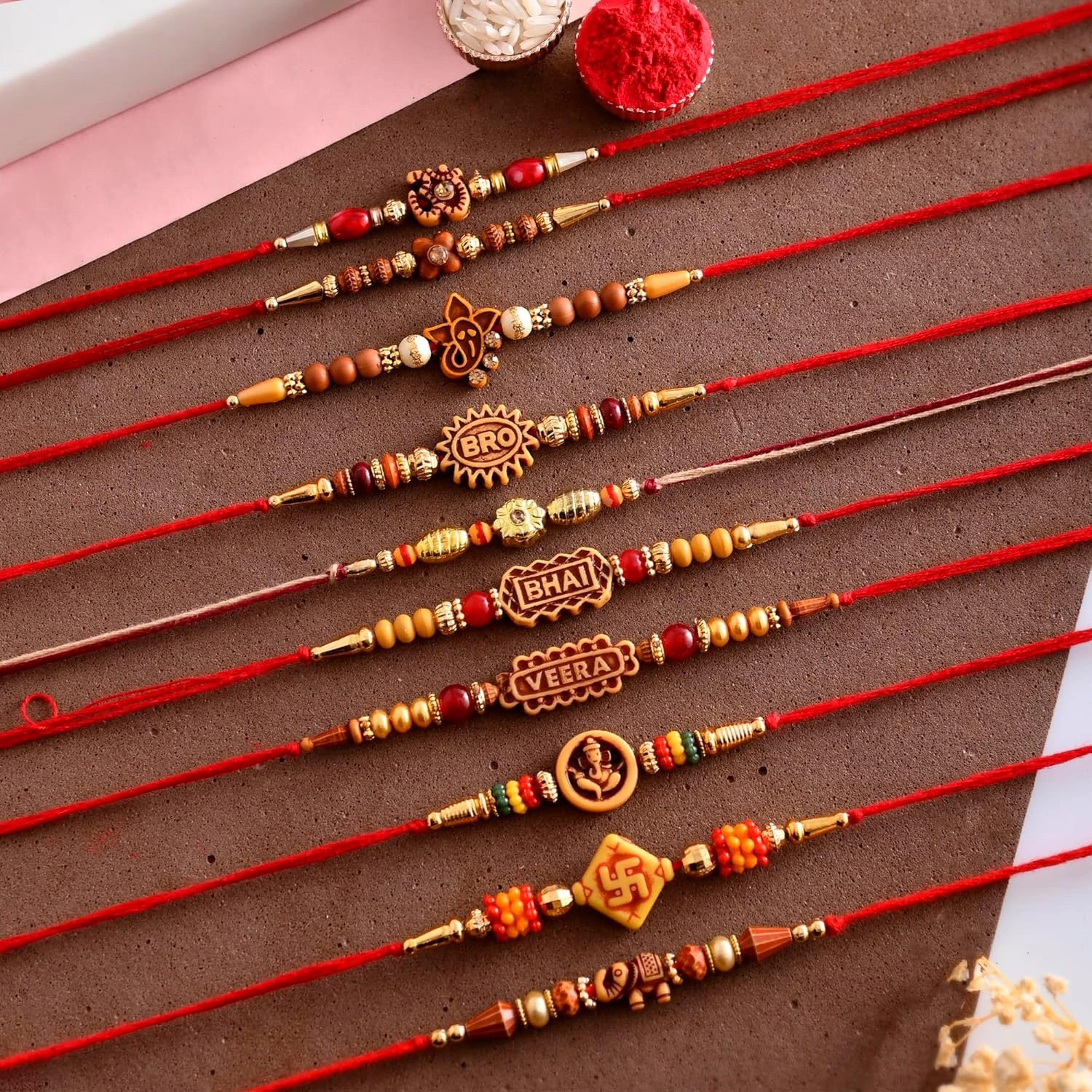 1. Package included: 10 Assorted Designer Rakhi with Tilak pack.