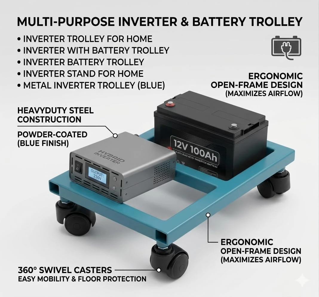1. LONG-LASTING & RELIABLE UTILITY ACCESSORY With its durable metal construction and smooth wheel mobility, this inverter battery trolley stand is designed for everyday use. It offers a perfect combination of strength, convenience, and multipurpose functionality, making it a valuable addition to any home or workspace.