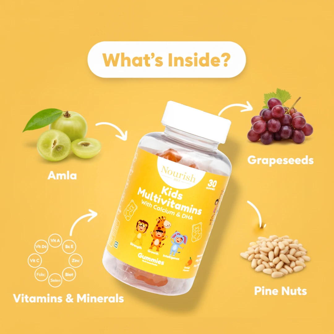 Nourish BIO Multivitamin Gummies with Calcium, Vitamin D3, A, B6, B12, C, E, for growth & development Supports Immunity, Energy, and Bone Health 30 Orange-Flavored For Ages 3+ and Up (Sugar-Free) Pack of 1