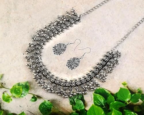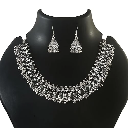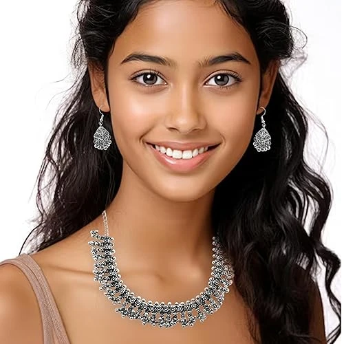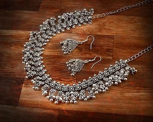 Elegant Oxidized Silver Design – Beautifully crafted antique-style necklace set with intricate detailing and matching jhumka earrings.