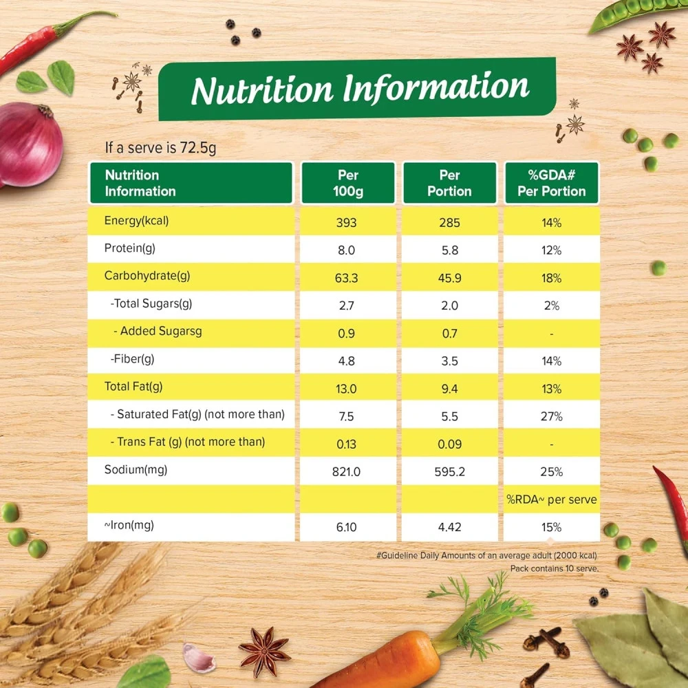 NOODLES Wheat flour (atta) (85.3%), Palm oil, Iodised salt,Thickeners (508, 412), Humectants (451(i), 452(i)) and Acidity regulators (501(i),500 (i)). Masala *TASTEMAKER® Mixed spices (22.5%) [ᶺRoasted spice powder (6.4%) (Coriander (1.9%), Turmeric (1.6%), Cumin, Aniseed, Black pepper (0.4%), Fenugreek, Ginger, Clove (0.1%), Green cardamom, Nutmeg), Dehydrated onion (4.2%), Dried garlic, Red chilli powder (2.5%), Red chilli bits (1.1%), Coriander powder (1%), Turmeric powder (0.8%), Dried ginger powder, Aniseed powder, Black pepper powder (0.5%), Cumin powder, ᶺRoasted cumin(0.4%), Fenugreek powder, ᶺRoasted garam masala powder (0.3%) (Cinnamon, Bay leaf (0.04%), Green cardamom, Large cardamom, Black pepper (0.02%)), Compounded asafoetida (Refined wheat flour (maida), Carrier (414), Asafoetida), Spice extract blend (Capsicum extract, Coriander extract (0.001%),Cumin extract), Star anise powder (0.2%)], Toasted onion flakes (Onion(12.4%), Corn oil), Sugar, Dehydrated carrot (8.5%), Dehydrated green peas (8.2%), Noodle powder [Refined wheat flour (maida), Palm oil, Iodised salt, Gluten, Thickeners (508, 412), Acidity regulators (501(i),500 (i)), Humectant (451(i))], Toasted onion powder (Onion (5.9%), Corn oil), Corn savoury powder (Corn starch, Iodised salt, Yeast extract), Yeast extract powder (Yeast extract, Salt, Sunflower oil), Iodised salt, Thickener (508), Dehydrated Kasuri methi leaves (1.4%), Edible starch, Palm oil, Acidity regulator (330) and Mineral (Ferric pyrophosphate).