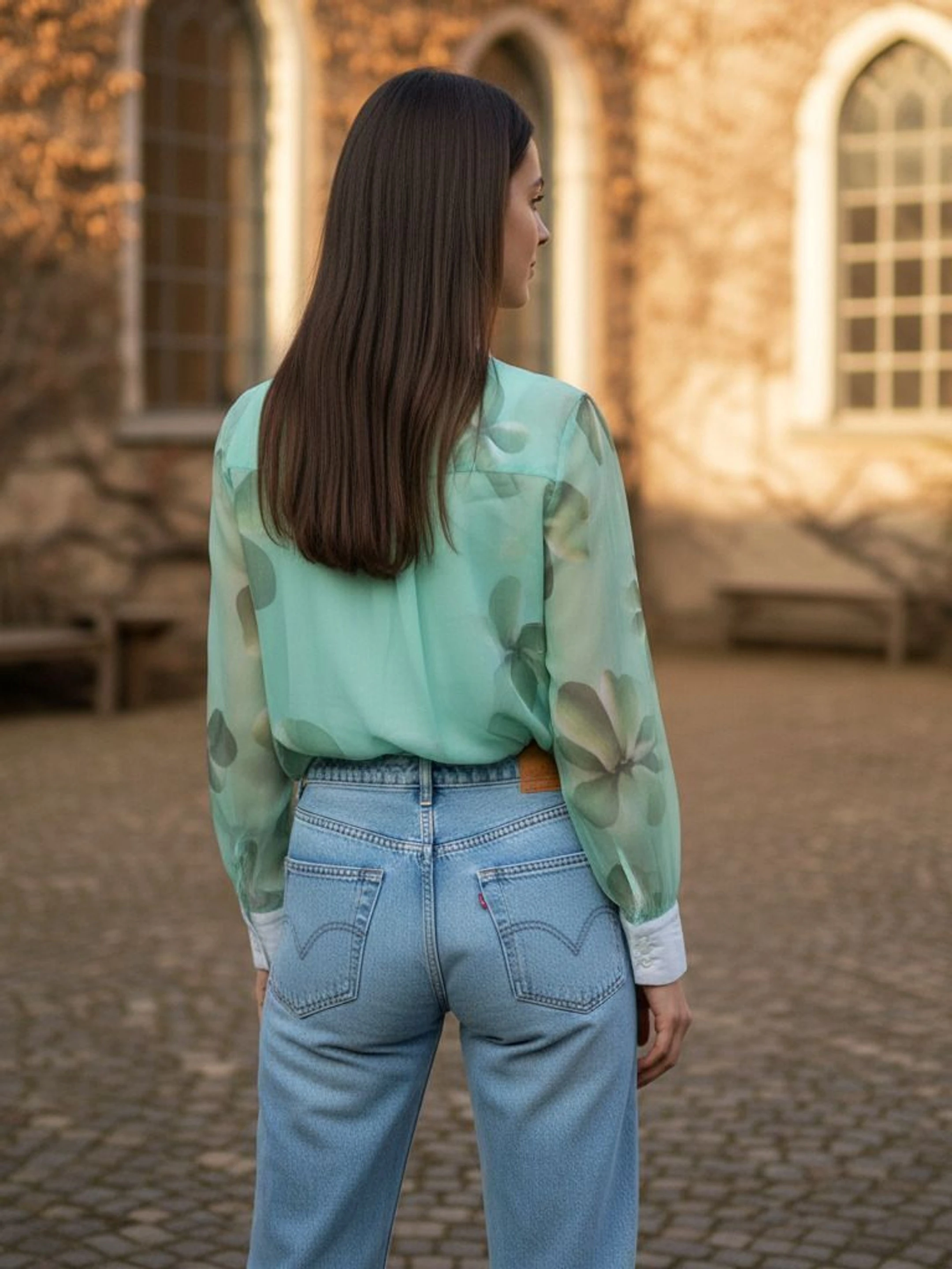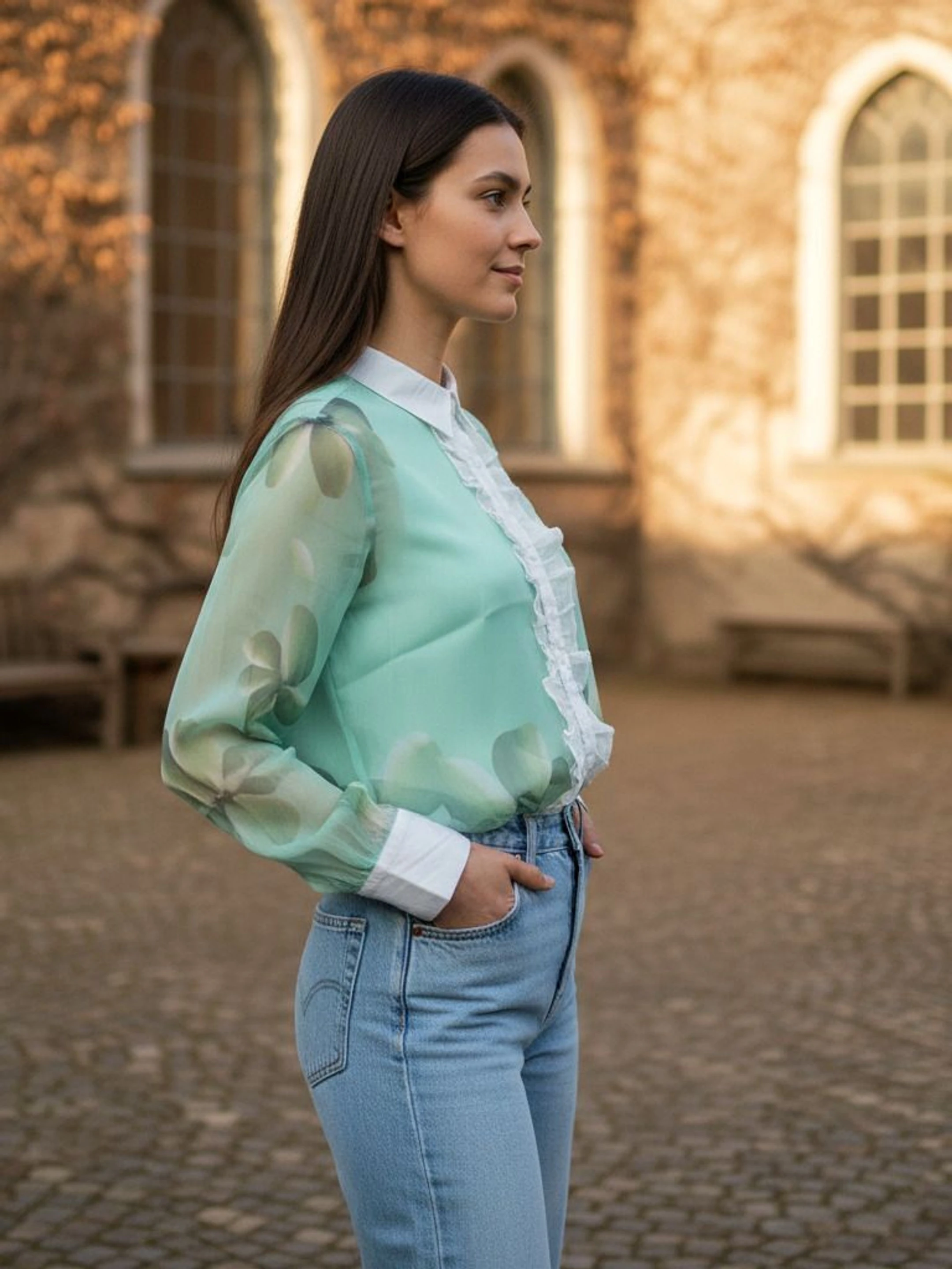 Styling: She is wearing the blouse tucked into high-waisted light-wash blue jeans, creating a "casual-chic" aesthetic.