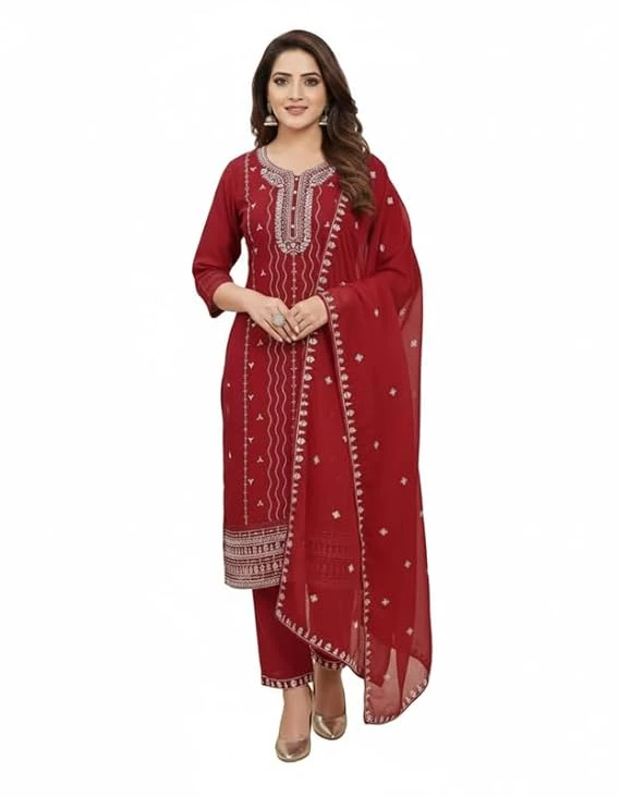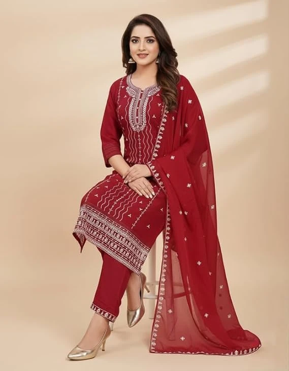Pick Cell Embroidery Work Kurti Set for Women | Roman Silk 3 Piece Suit with Kurti, Bottom and Dupatta | Stylish Red Ethnic and Elegant Party Festive and Office Outfit