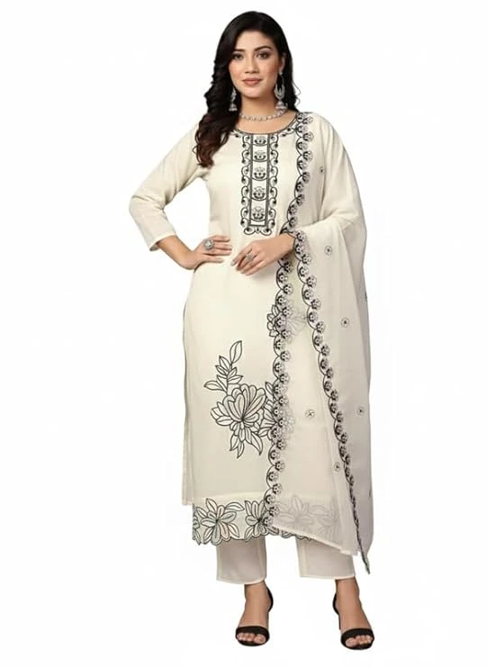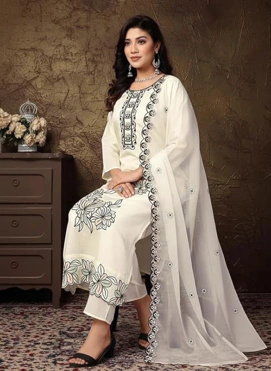 Pick Cell Women’s Roman Silk Embroidery Work Kurti Set | 3-Piece Suit with Dupatta | White Ethnic Wear and Crop-Inspired Straight Fit Kurta, Tailored Pants