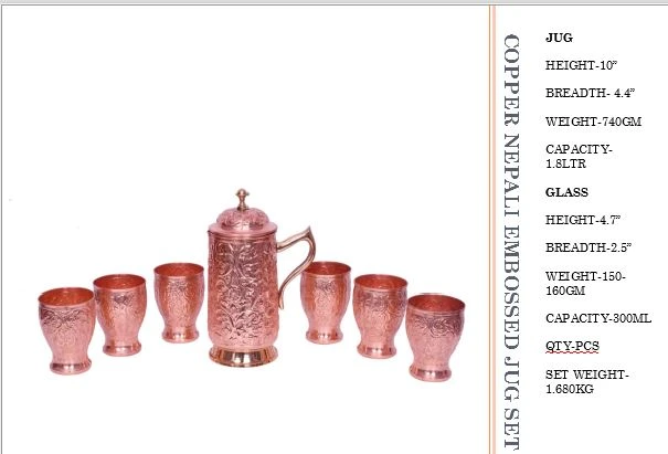 Premium Quality Beautiful and Attractive Polished Copper Nepali Embossed Jug Set for Water Serving & Traditional Use