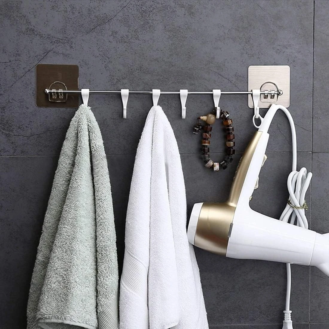 Premium Self Adhesive Kitchen Accessories Items Organizer Rack Stand, Wall Hanging Hooks Strong Without Drilling/Bathroom Door Cloth Hanger (9 Hooks), Stainless Steel