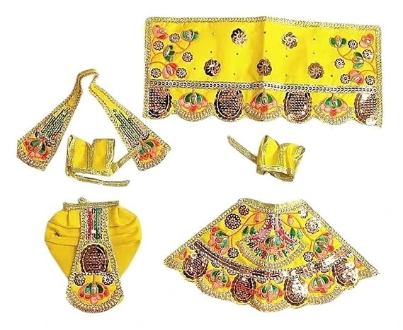Our Radha Krishan Yugul Jodi Poshak Silk Shine Dress is a set of six elegantly crafted garments, perfect for celebrating the divine union of Radha and Krishna during Diwali Puja. It includes Patka, Dhoti, and Choli for Krishna, and Lehenga, Chunri, and Choli for Radha, each adorned with intricate designs and silk shine fabric.