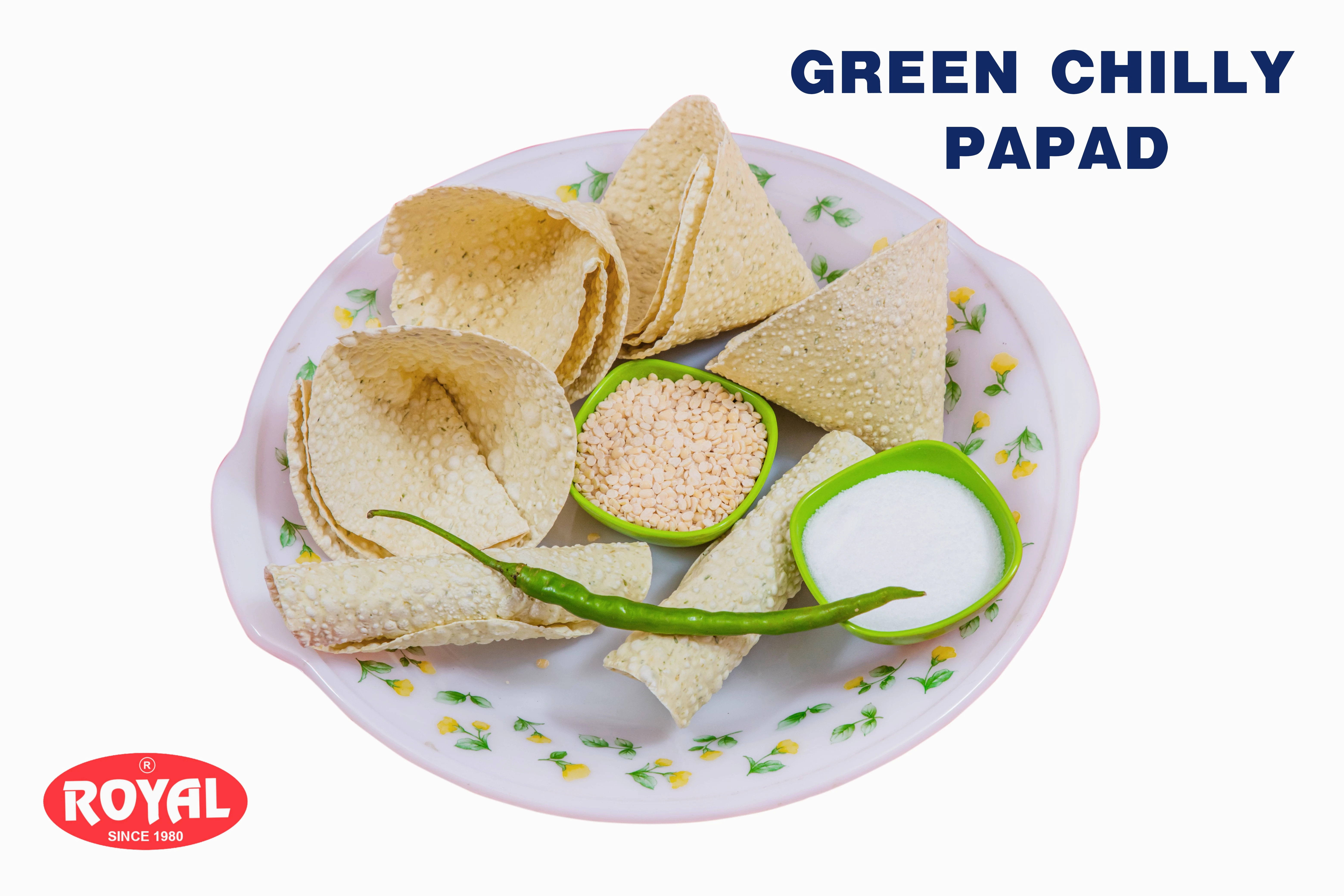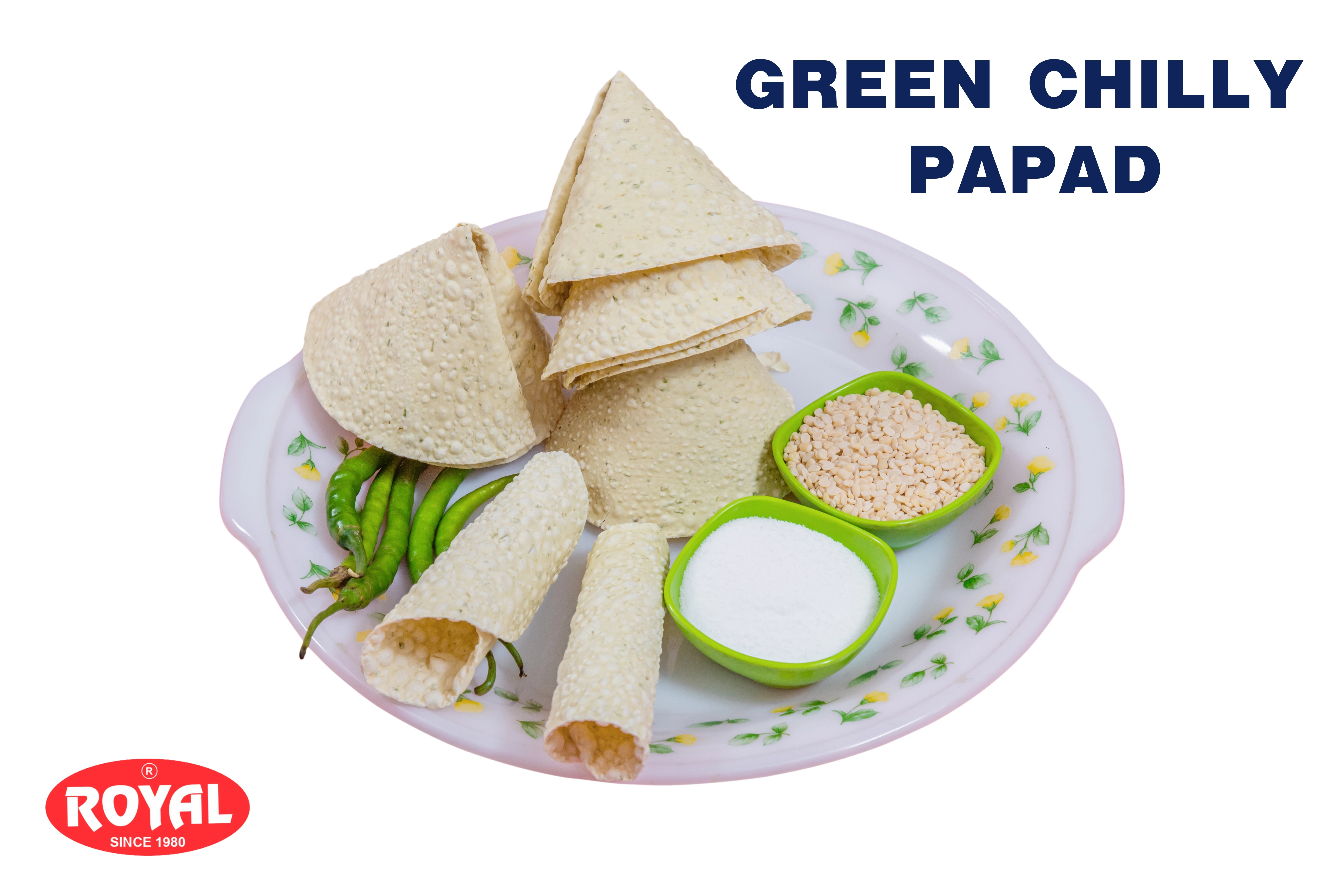 A SPICY PAPAD HAVING PIECES OF GREEN CHILLIES AND SPICES