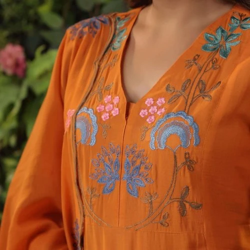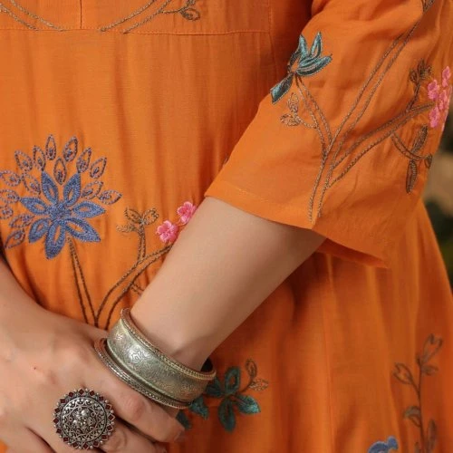 Embrace the perfect blend of tradition and modernity with the Rust Orange Viscose Chanderi Embroidered Ladies Kurta Set. It's not just a piece of clothing; it's a statement of style and elegance.