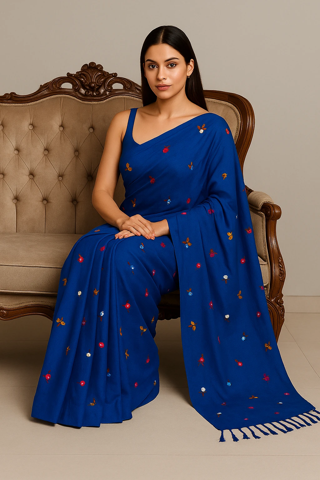 SAREEN Handcrafted Pure Khadi Cotton Saree, Multicolor Hand-Embroidered Floral Motifs, Traditional Style with Tassels (Peacock Blue)