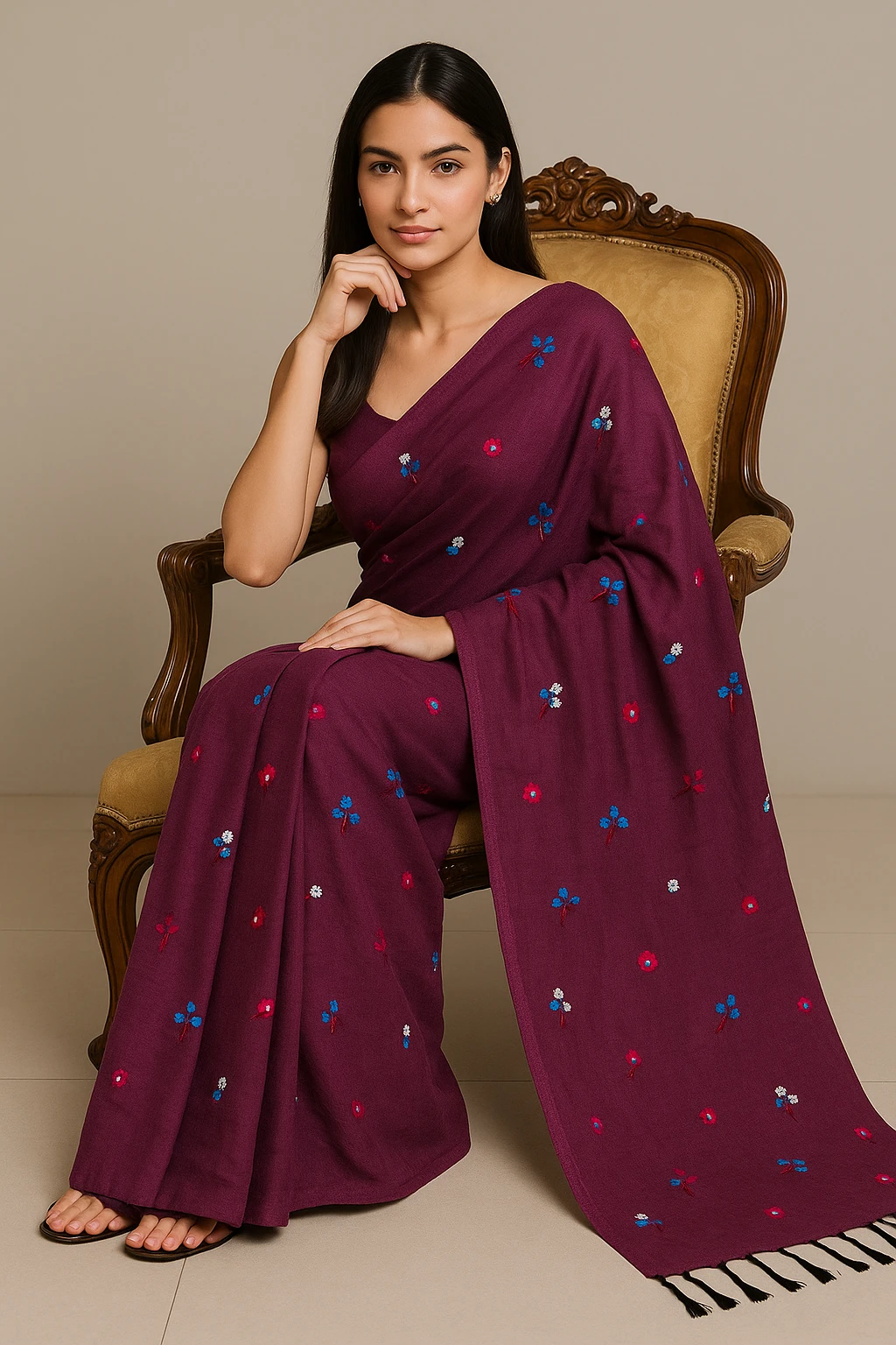 SAREEN Handcrafted Pure Khadi Cotton Saree, Multicolor Hand-Embroidered Floral Motifs, Traditional Style with Tassels (Royal Purple)