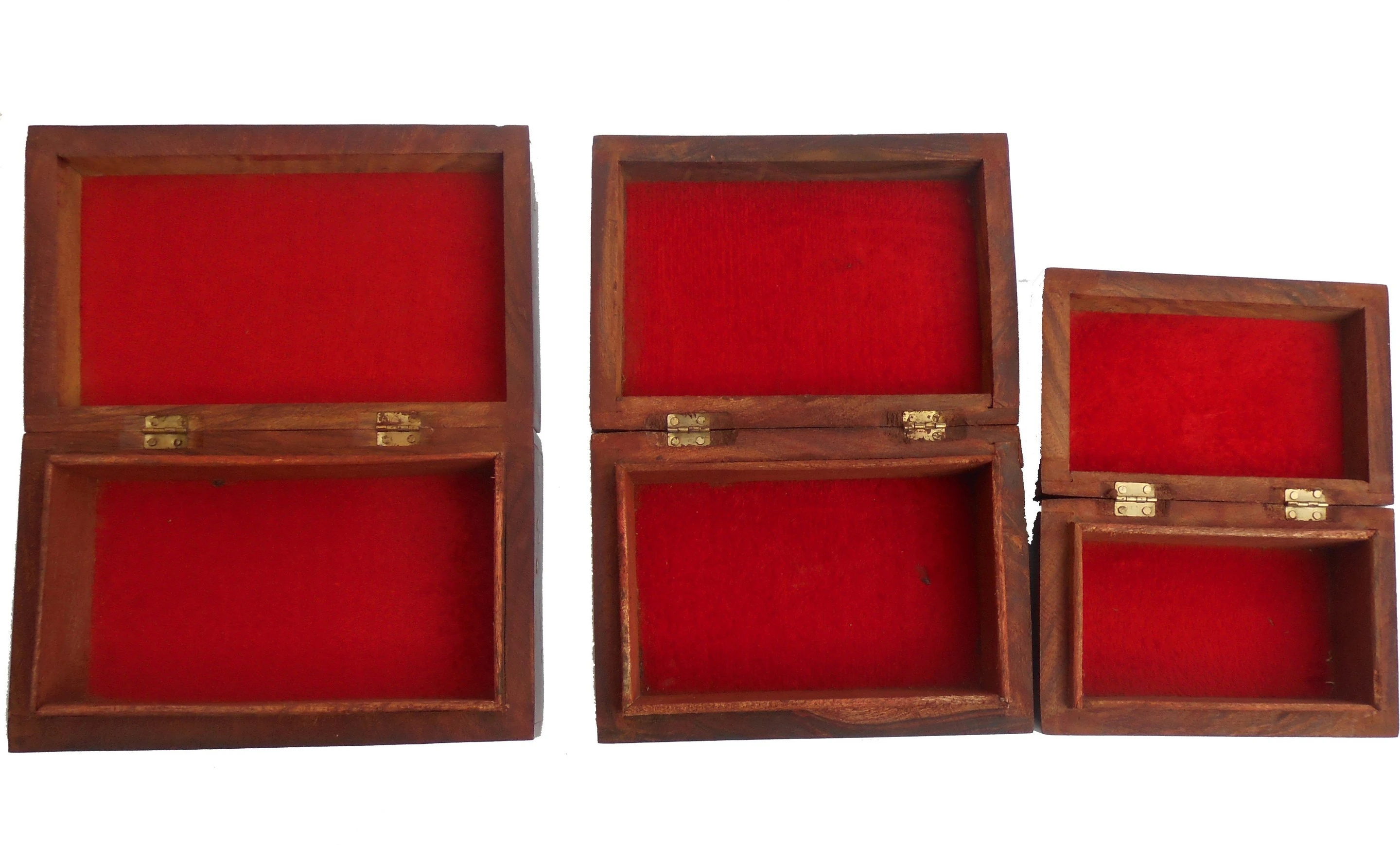 Thick sheesham wood & brass made jewellery box set well carving on it it is very attractive in look as you cansee in the pictures above the inner space is 1inch less then the given length because it is made of thick wood to protect your jewellery note- the set of these box is in reducing size from 1st to 3rd.