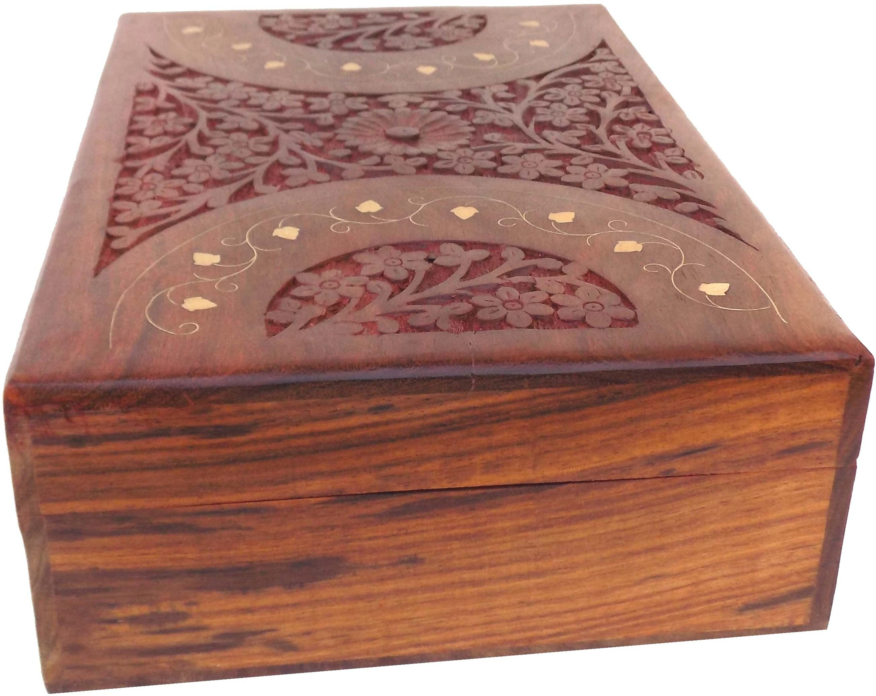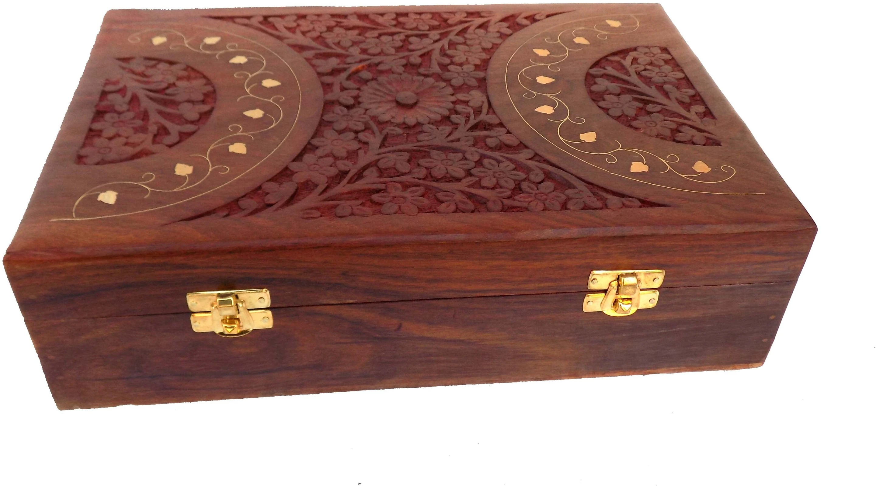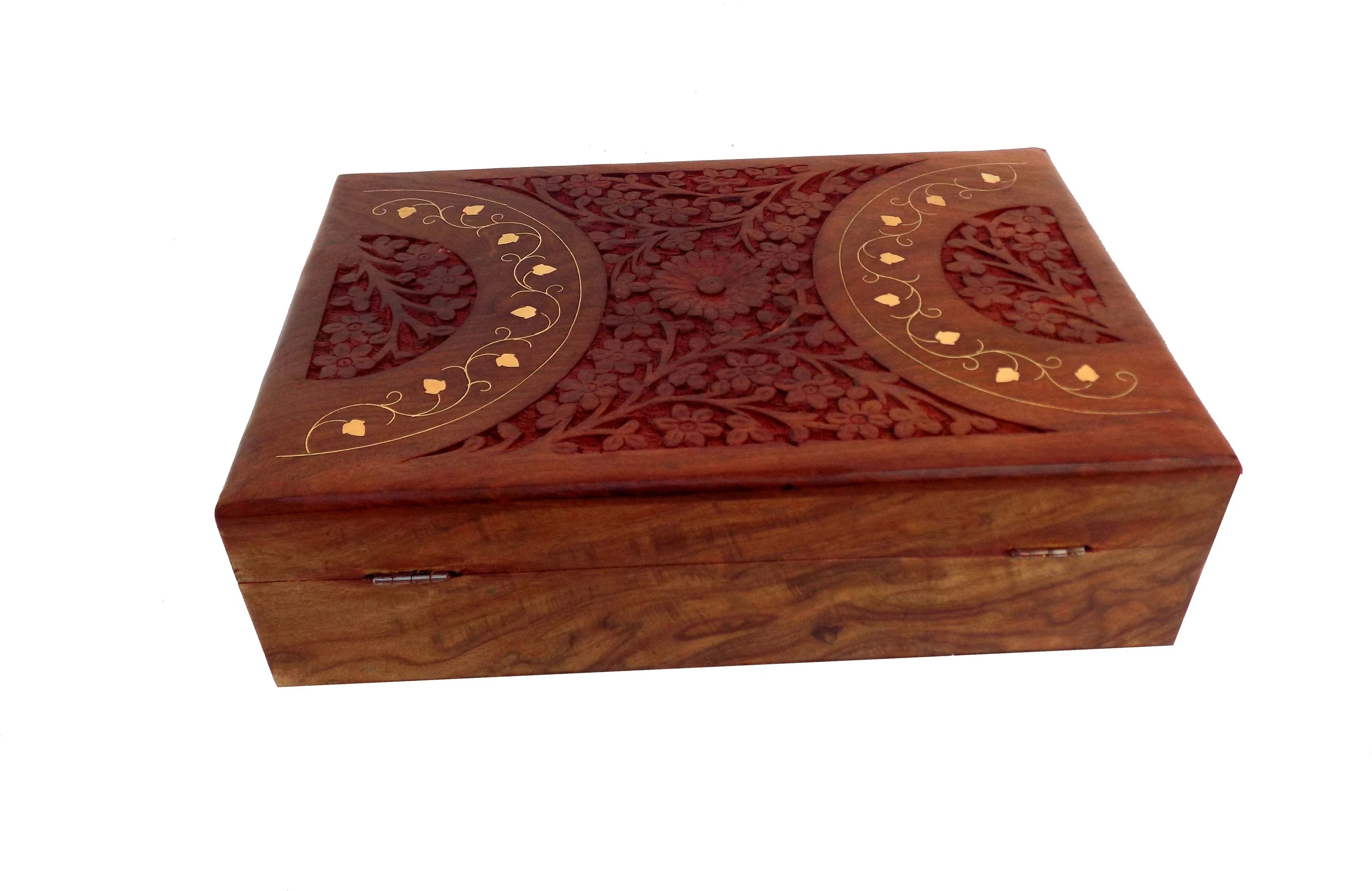 ALL IN ONE SHOP PRESENT A THICK SHEESHAM WOOD MADE WELL CARVED AND BRASS INLAY WORK DONE JEWELLERY BOX IT IS HANDCRAFTED AND ONE OF THE FINE CRAFTSHIP OF OUR YOU CAN USE IT AS A JEWELLERY BOX,MAKEUP BOX OR OTHER UTENSIL NOTE- 1 COLOUR OF THE EACH PRODUCT IS DARK OR LITE DUE TO NATURE OF WOOD