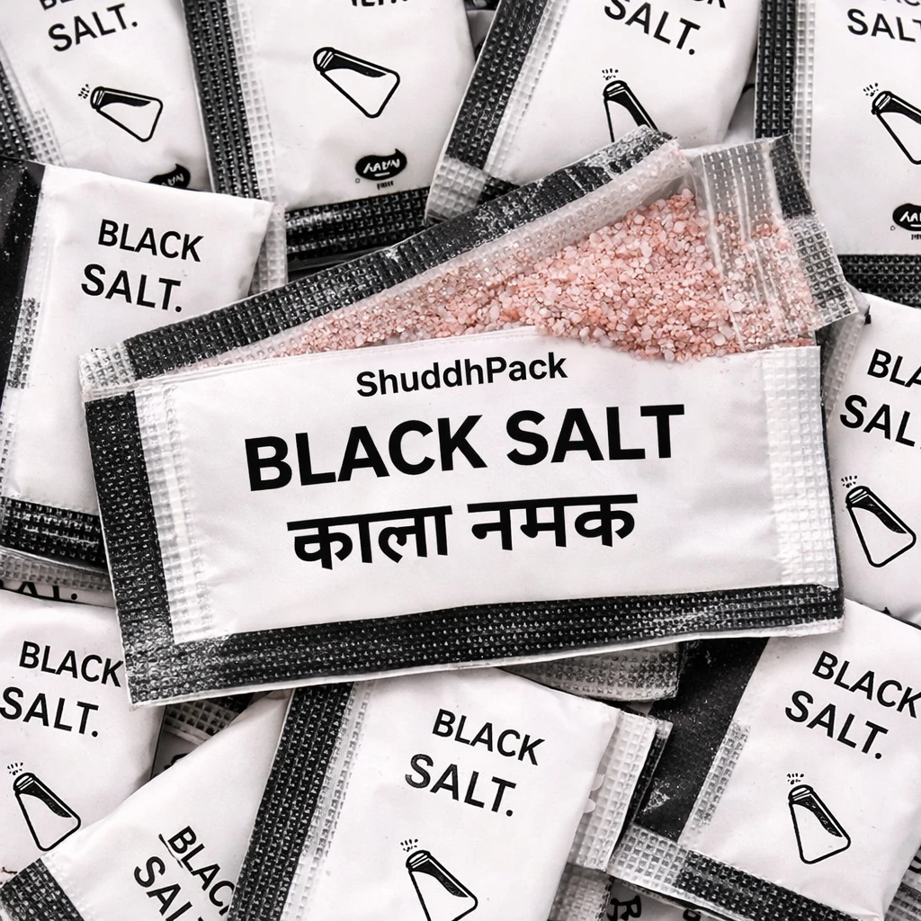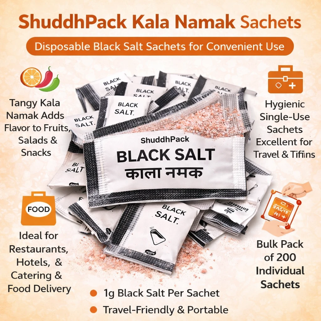 Black salt is widely used in Indian cuisine to enhance the flavor of fruits, chaats, salads, snacks, raitas, and beverages. These disposable sachets are especially useful for restaurants, hotels, catering services, food delivery businesses, and takeaway meals.