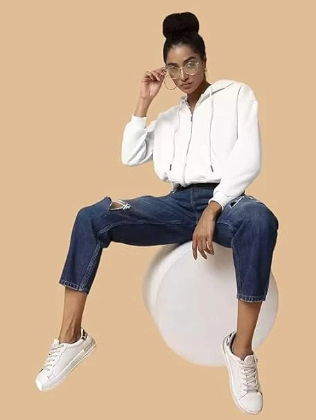 Soft Fleece Solid Long Sleeve Drawstring Crop Zipper Jacket Hooded Full Zip Up Sweatshirt for Women's Girl's Winter Wear Crop Hoodie | Color White