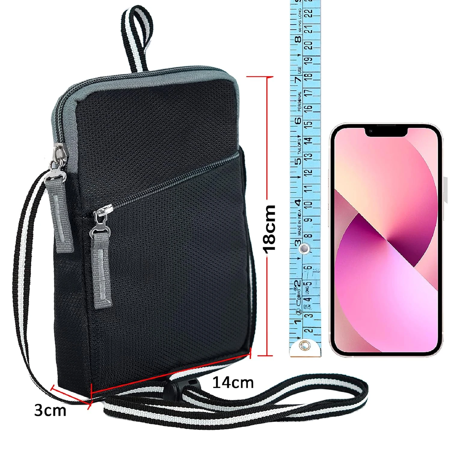 •  Messenger Sling Bag Dimensions – Length (Horizontal distance) - 18cm, Height - 14cm, Width - 3 cm. small capacity but perfectly fits up to 9" Tablet.
