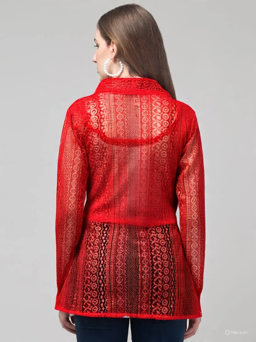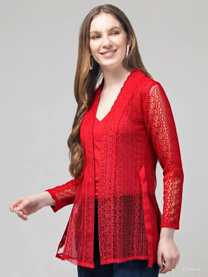 Talitha Fashion Women's Lace Shrug - Long Sleeve Regualar Open Front, Sheer Mesh Cover Summer Wear Full sleeves Jacket Style For Jeans (IN, Alpha, M, Regular, Red)