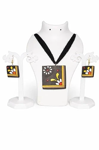 Terracotta Jewelry Set, Square Pendant Necklace and Earrings, Black Cord, Floral Design, Yellow White Red Pattern, Traditional Art