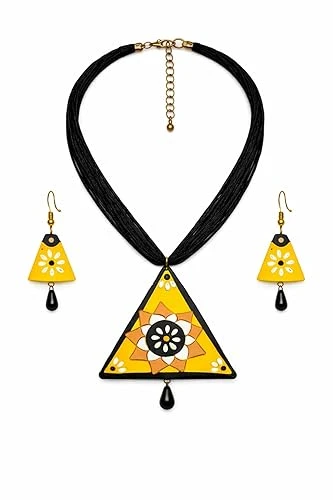 Handcrafted Yellow Triangle Floral Pendant Necklace and Earrings Set, Black Cord, Traditional Indian Jewelry, Tribal Design, Sunflower Pattern
