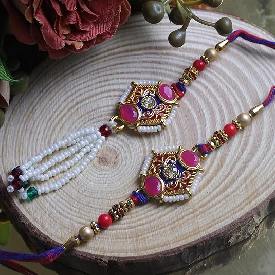 Rakhi Combo Set for Brother and Bhabhi Premium Lumba Floral Rakhi Kundan Bracelet for Bhaiya Men Bhabhi Women Raksha Bandhan Couple Pearl Set of 2 for Unisex Adult