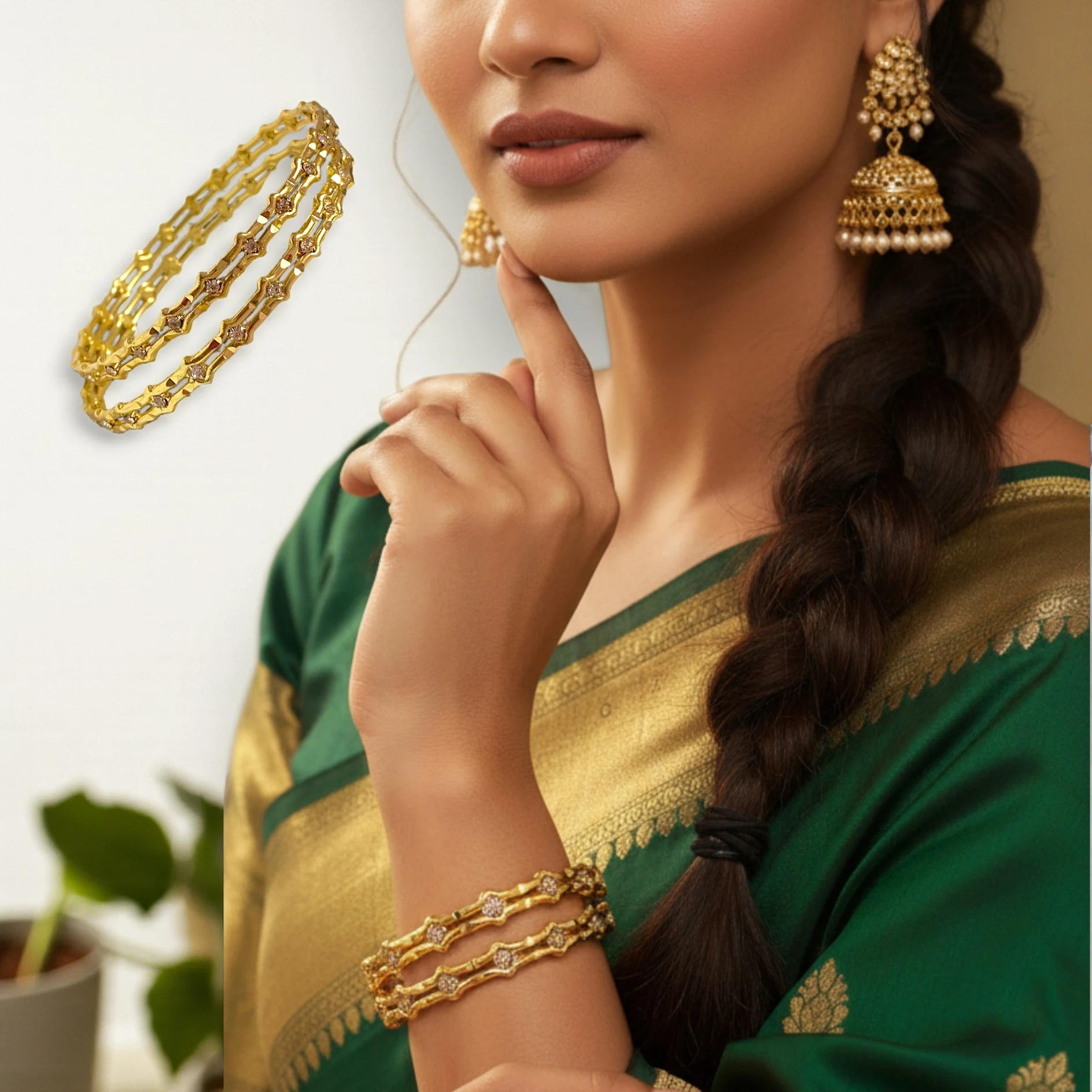 These exquisite gold-plated bangles are a perfect blend of traditional elegance and modern craftsmanship, designed to elevate every outfit with a touch of refined luxury. Crafted with precision, each bangle features a unique double-line structure adorned with delicately placed shimmering stone accents. The intricate wavy pattern adds depth and sophistication, highlighting the rich gold finish that resembles real gold jewellery. Lightweight yet durable, these bangles are ideal for daily wear as well as festive occasions.