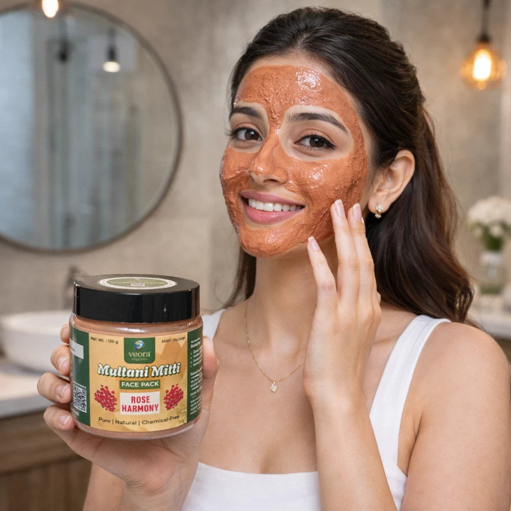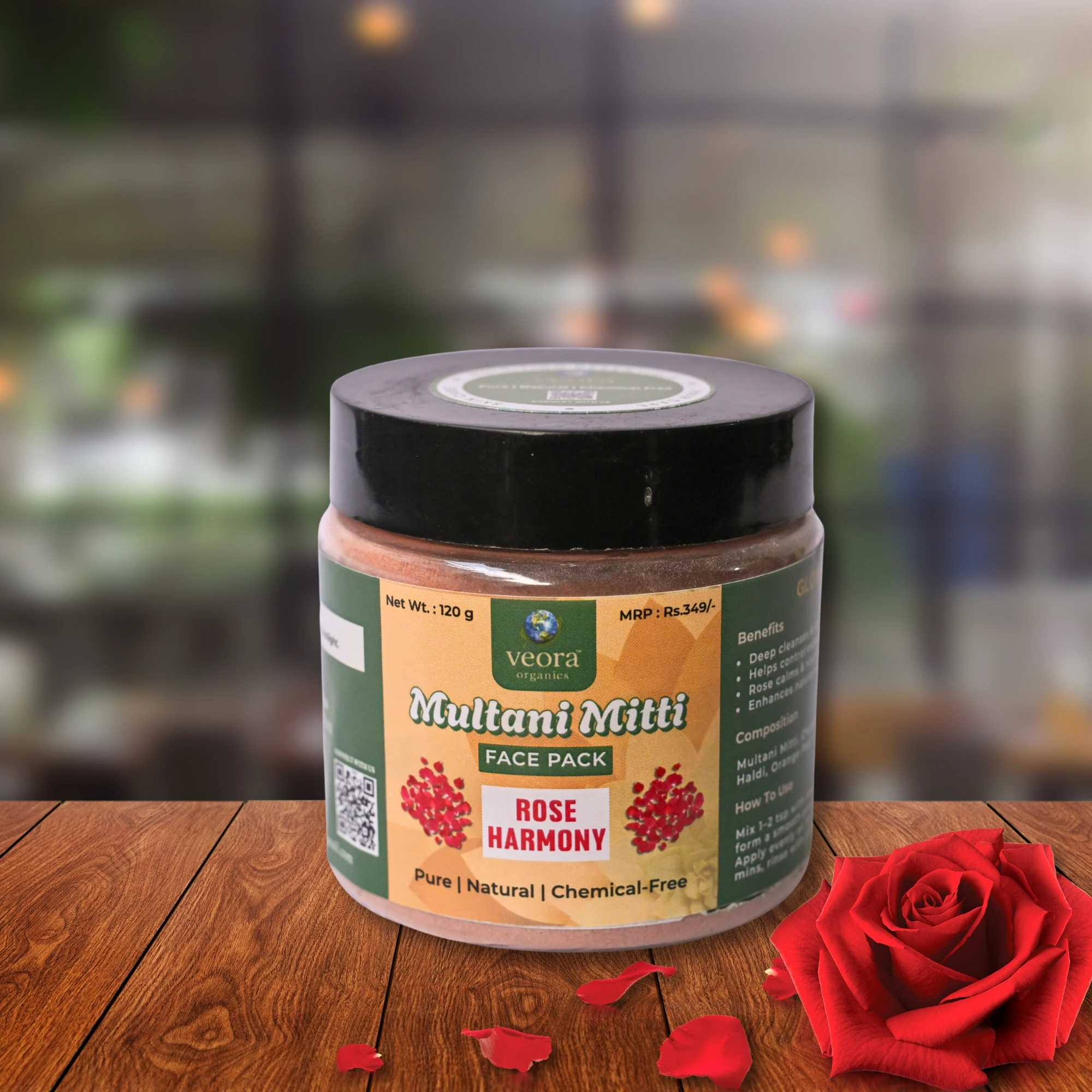 Introducing Rose Harmony by Veora Organics, a luxurious 100% pure and organic face pack crafted to envelop your skin in the gentle embrace of nature. This exquisite blend combines the timeless richness of Multani Mitti with secret organic ingredients, delivering a rejuvenating and soothing skincare experience.